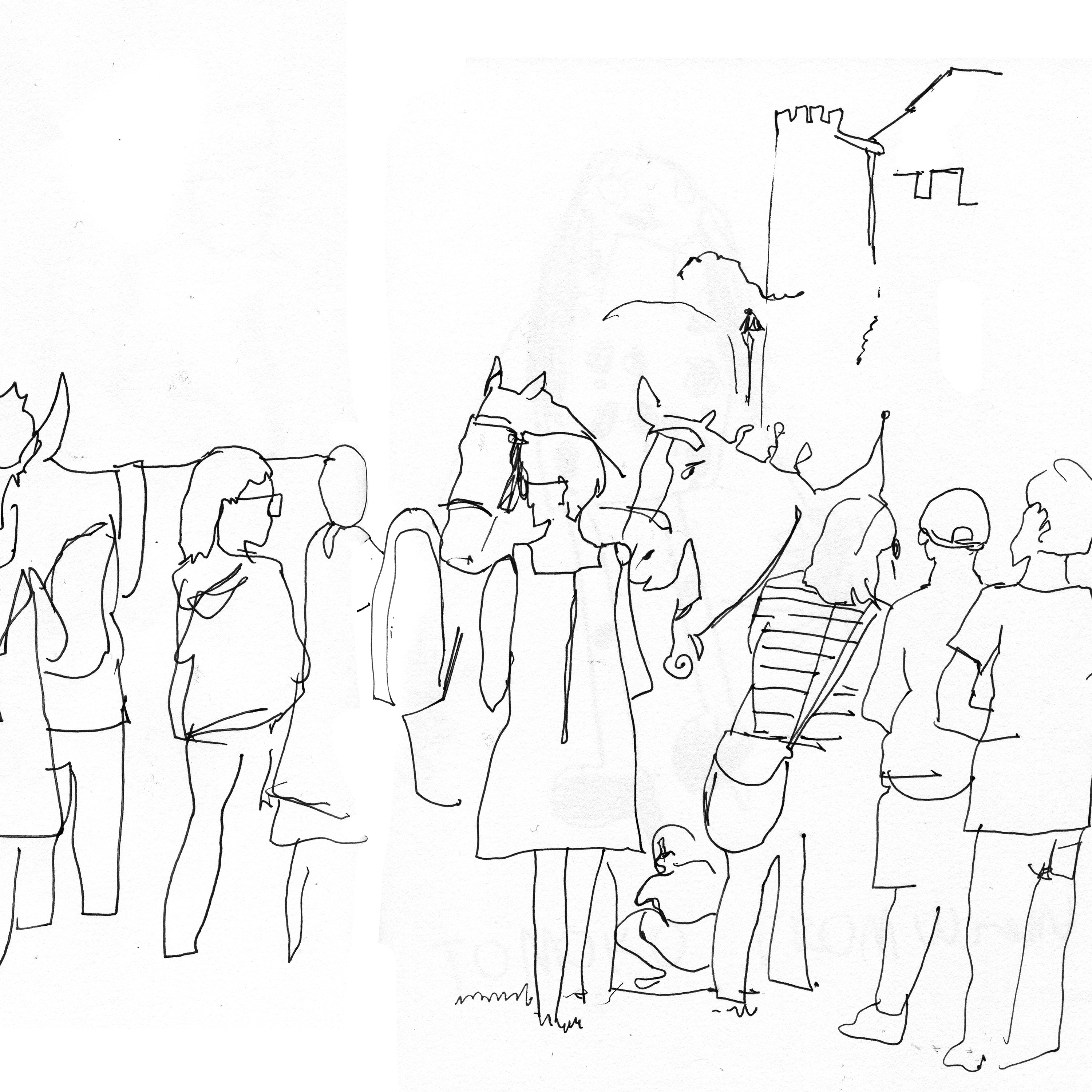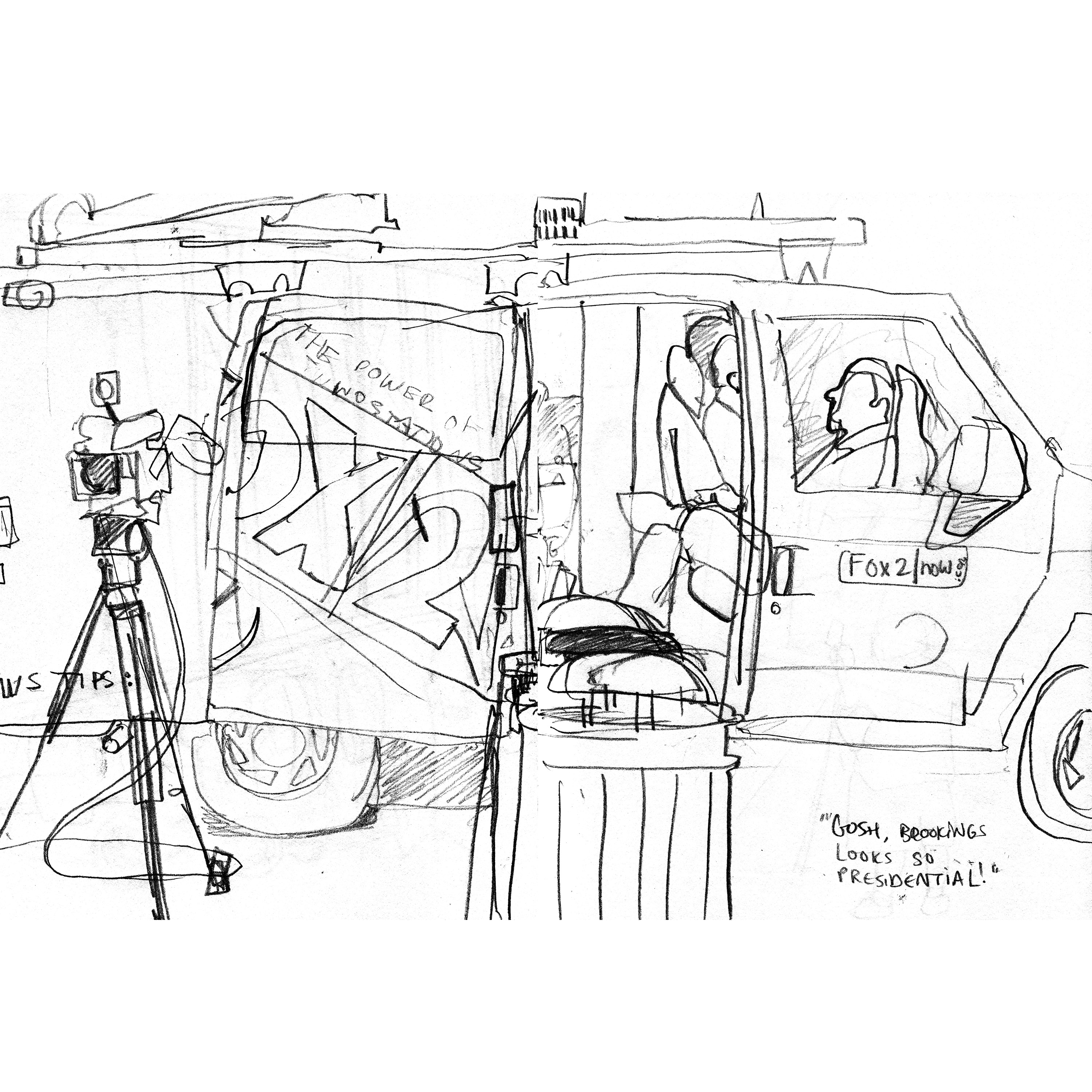 Working much like a news organization, the group stationed correspondents at locations around the Danforth Campus. Sketches, drawings, photographs, overheard quotes — all were relayed back to a central team of editors and designers, who then prepared material for posting to Facebook and Instagram.