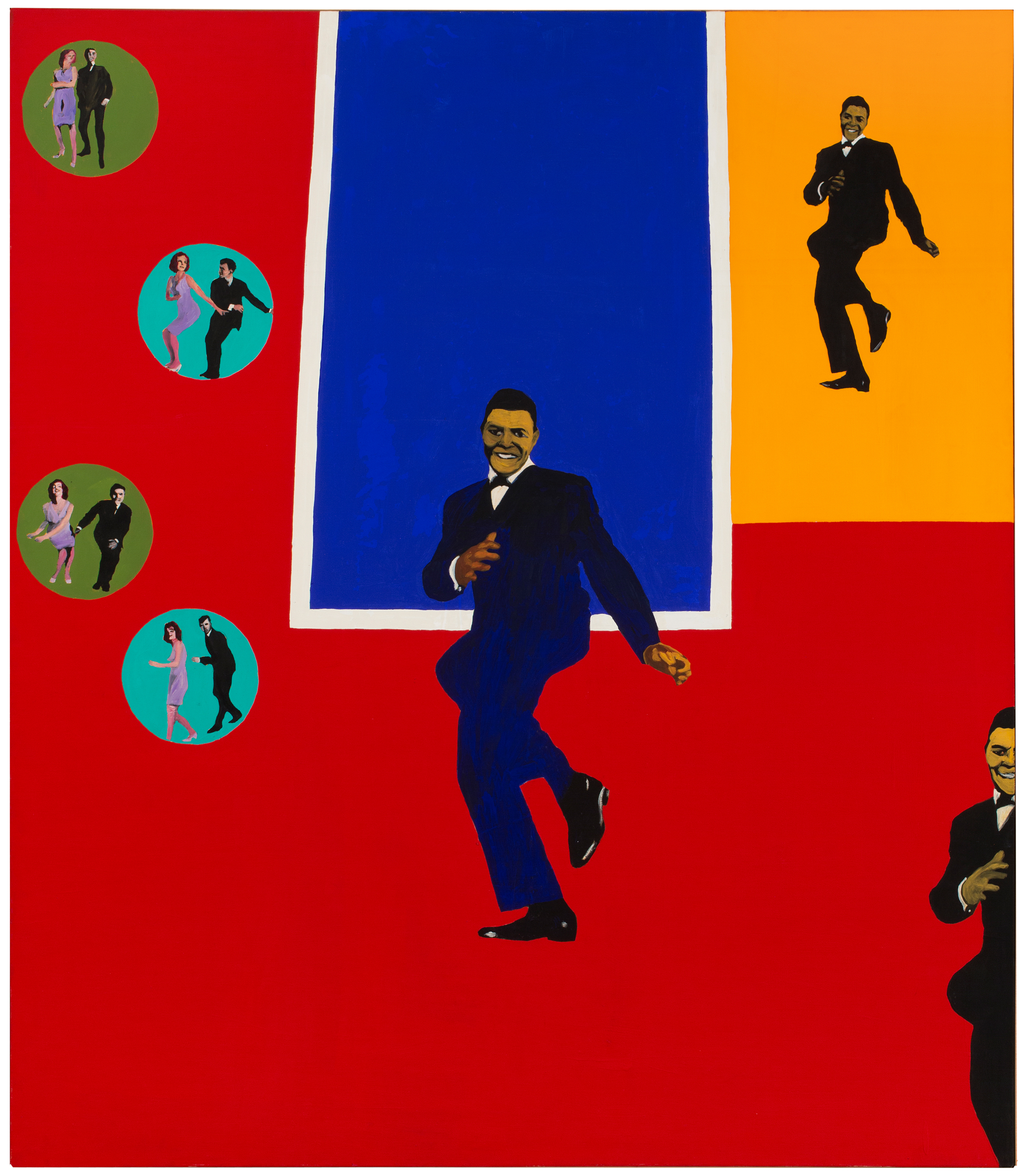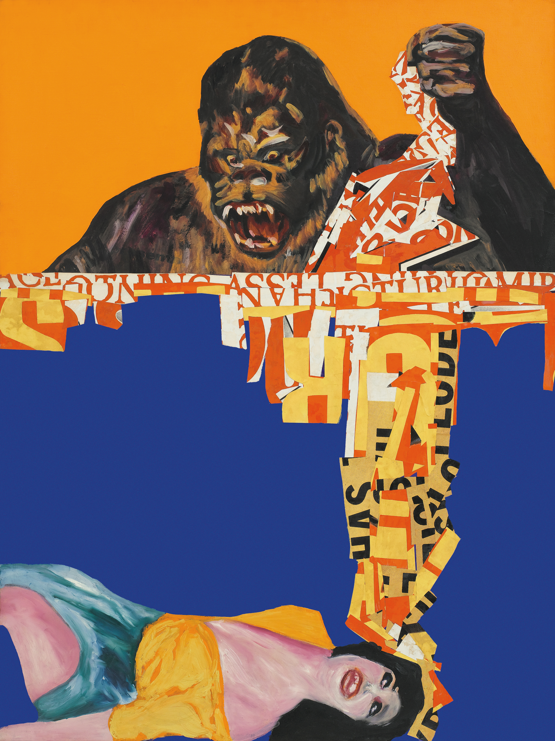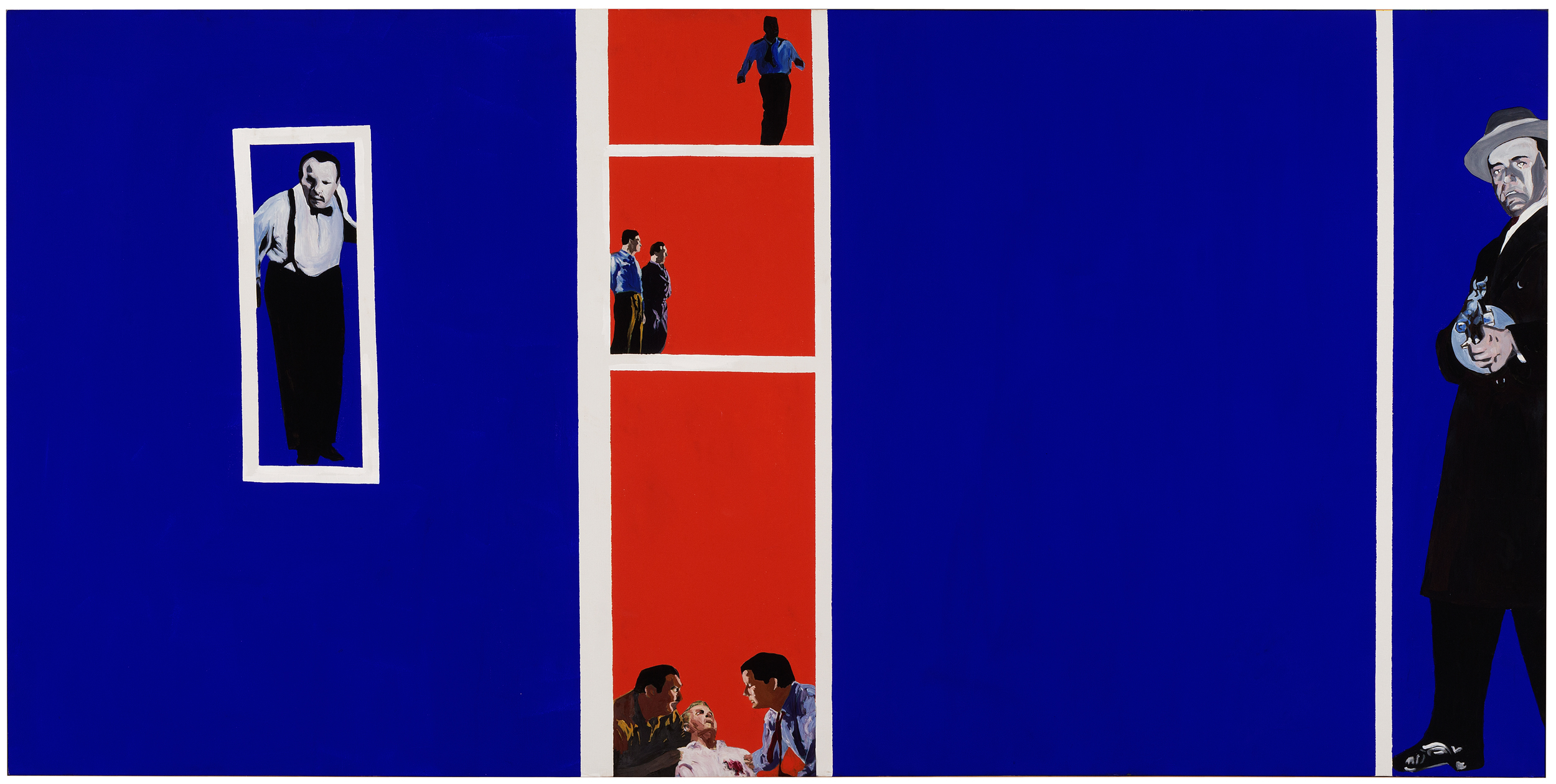 Drexler appropriated figures and subjects from a wide variety of popular sources, especially print media and film. Indeed, her use of cinematic imagery would anticipate the work of Pictures Generation artists such as Sarah Charlesworth and Robert Longo. Yet Drexler’s work also emphasized a sense of material and physicality. Rather than project and trace images onto canvas, as would some of her Pop Art contemporaries, several of whom had commercial backgrounds, Drexler cropped, enlarged, printed and collaged her source material, then applied acrylics on top. This method allowed Drexler to envelop and erase the photomechanical image while paradoxically imbuing it with a tactile sense of the artist’s hand.