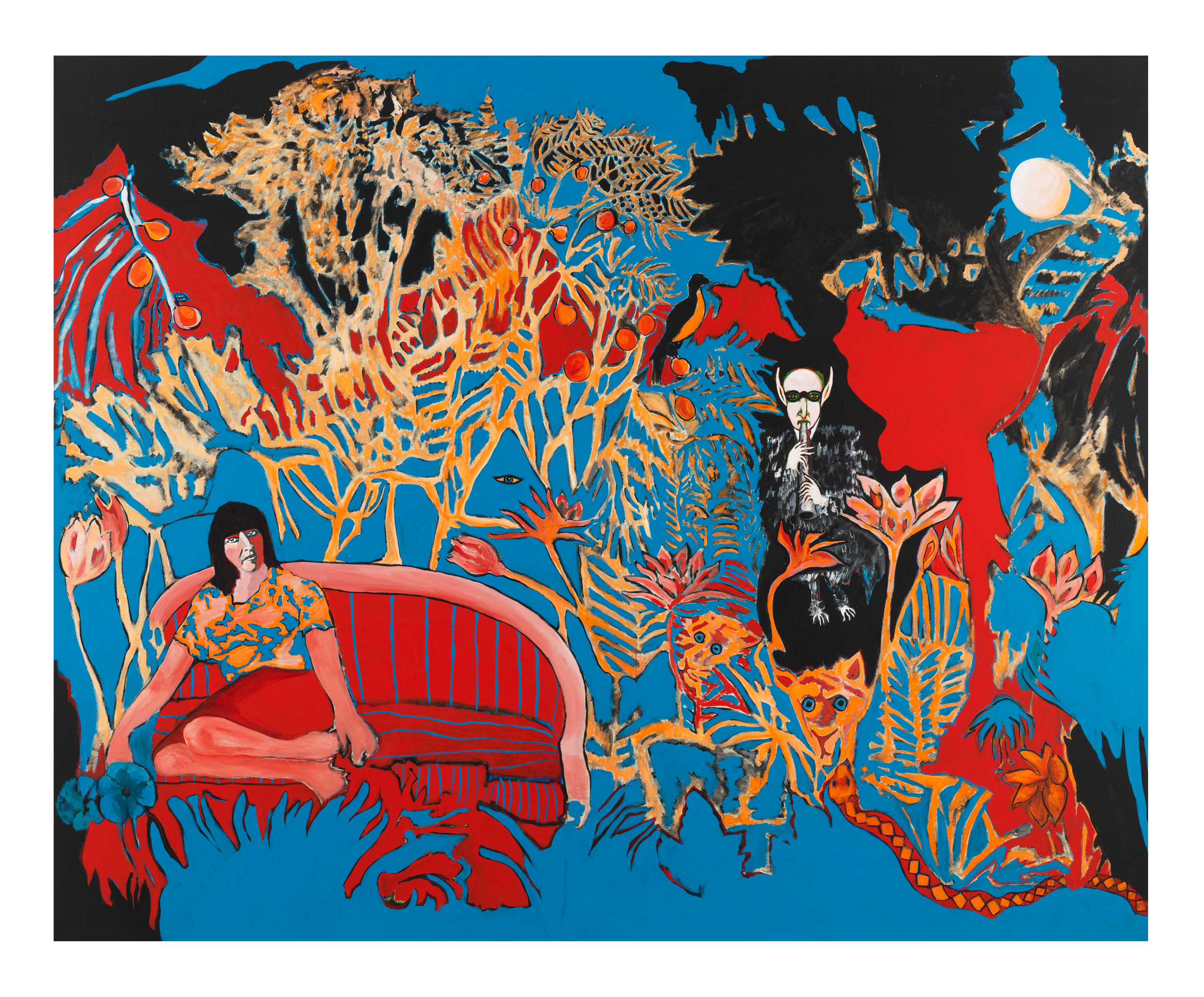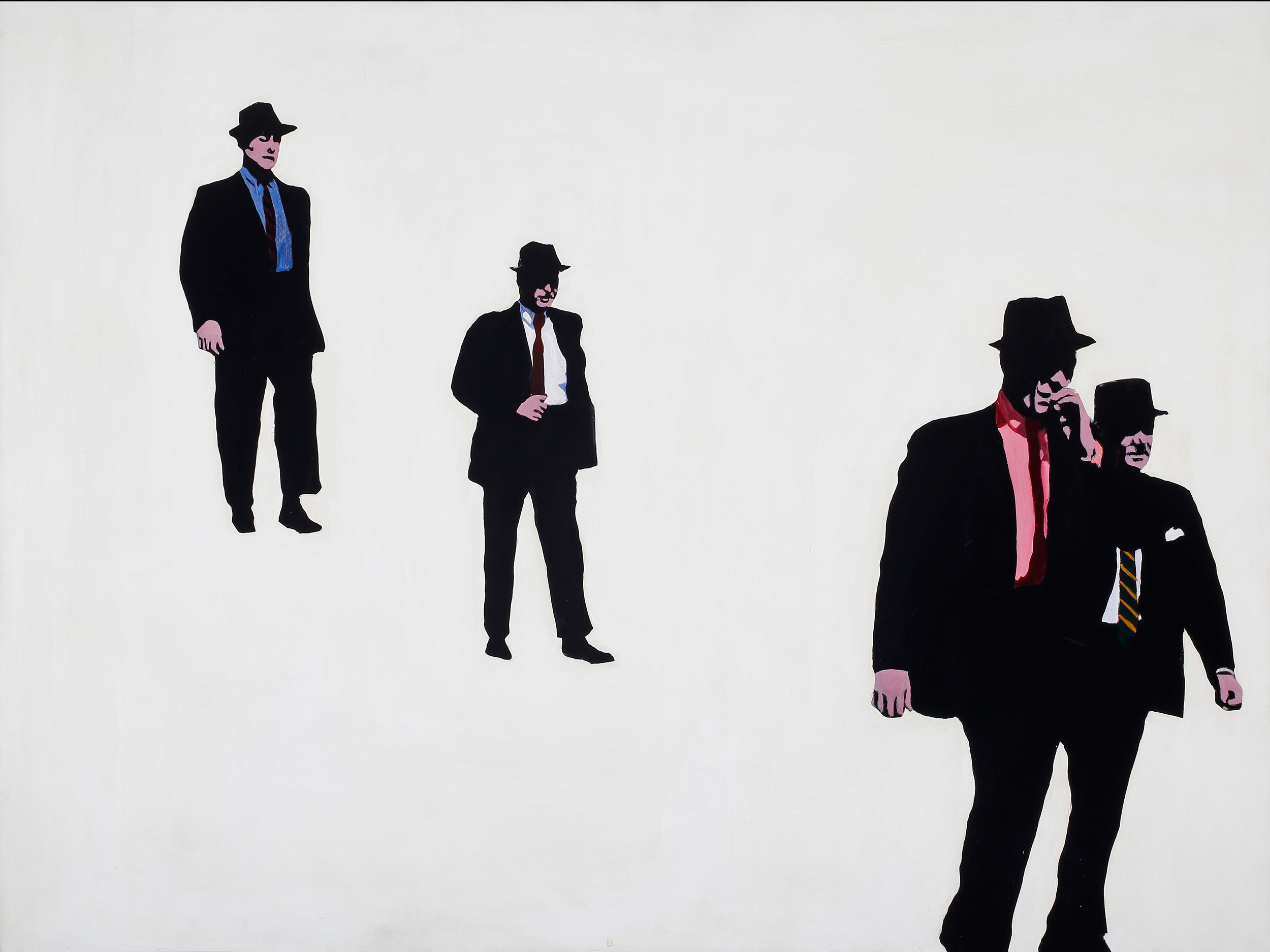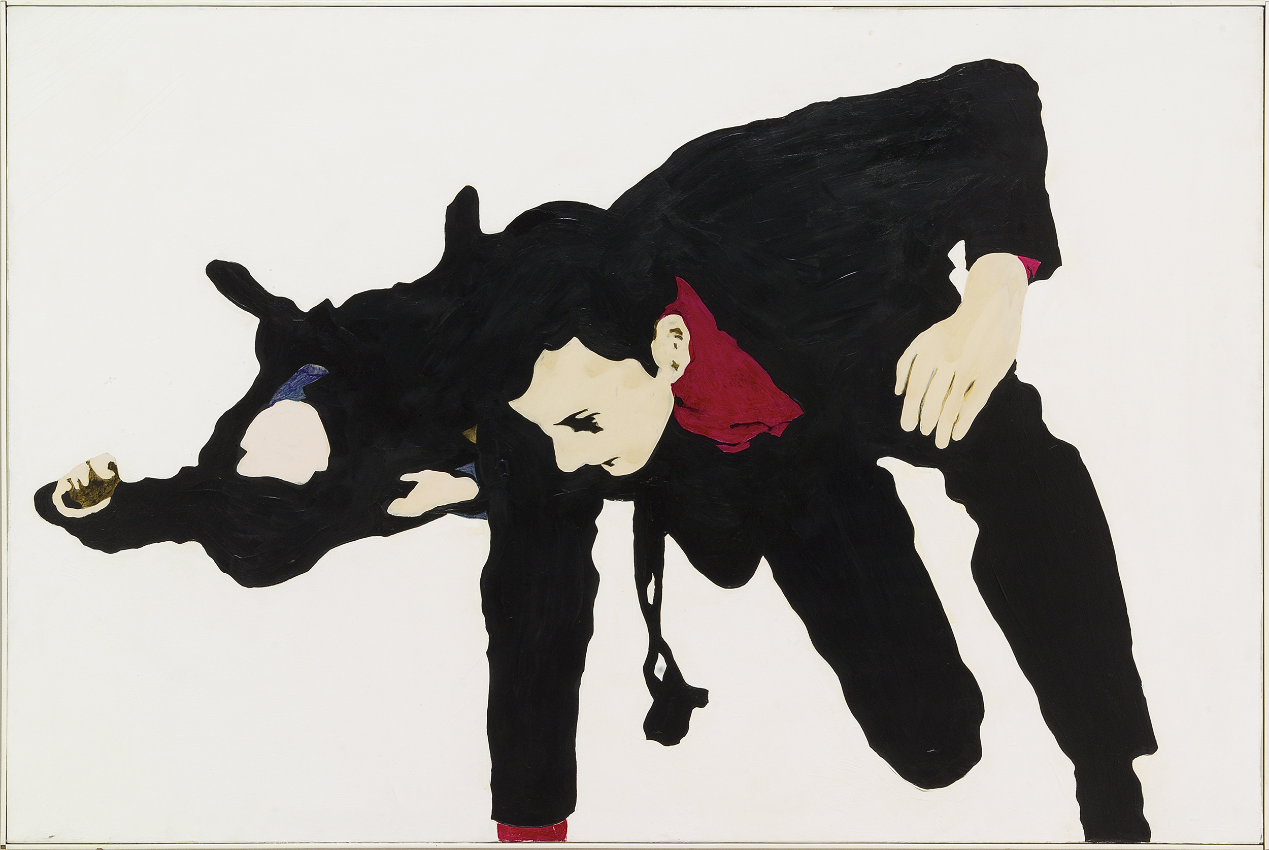 Works such as “Sorry About That” (1966), “Lear Executive” (1967) and “Decked Him” (1991) subvert and critique the iconography of male authority and power. With their liquid blacks and acid yellow backgrounds, “The Syndicate” (1964) and “Nuclear Blast/Amusement Park” (1998) are twin studies in malevolent ambiguity. “This is My Hell” (2013), one of Drexler’s most recent works, depicts a woman hoisted aloft by two dark-suited men, their heads framed by licks of fire, who seem to carry her toward the flames.