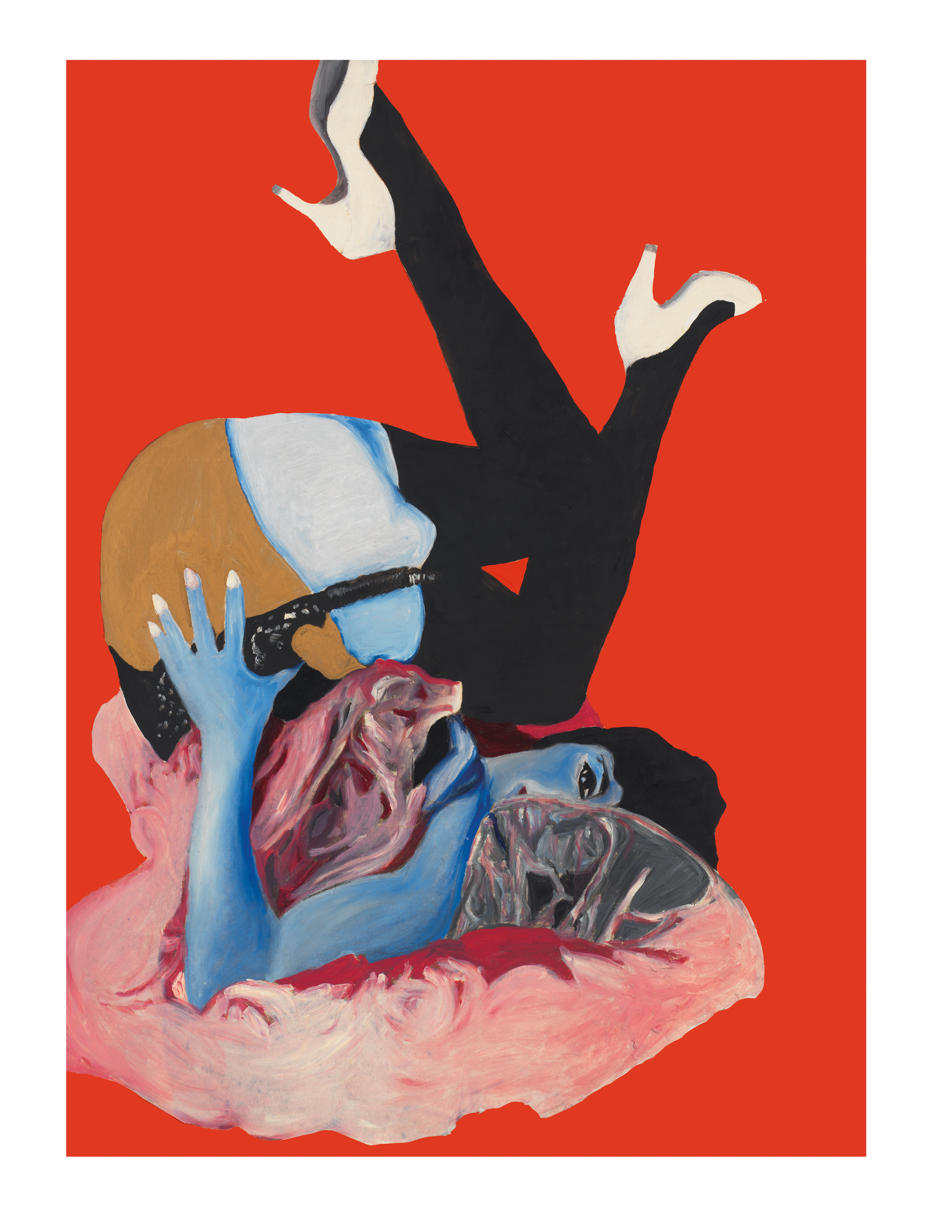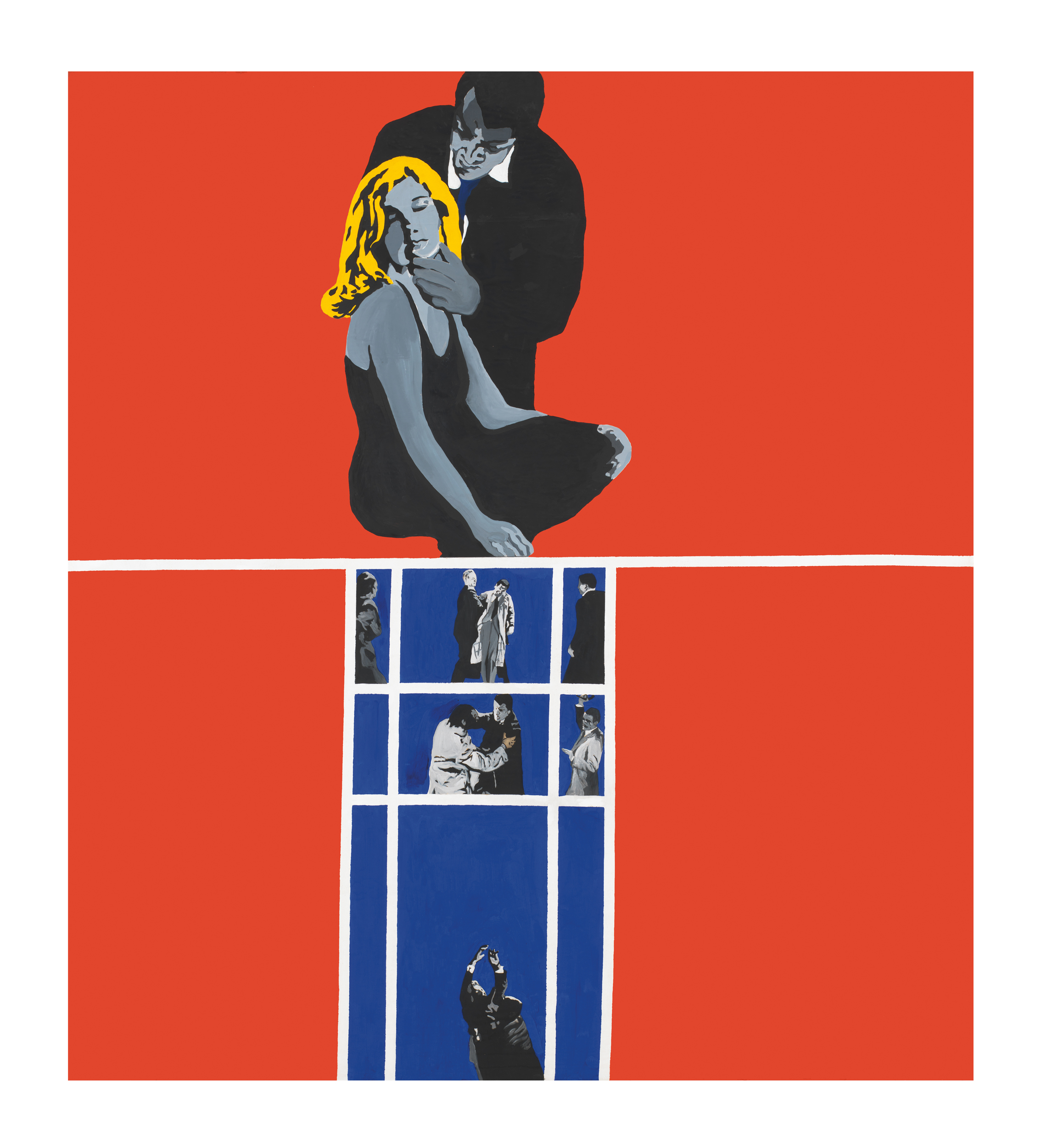 A kiss. A punch. A body braced for impact. The paintings of Rosalyn Drexler exude uncanny stillness, anticipation and, frequently, the dread of imminent violence. Moments of intimacy and conflict are frozen, sliced and readied for examination — excerpts from narratives whose conclusions can only be guessed.