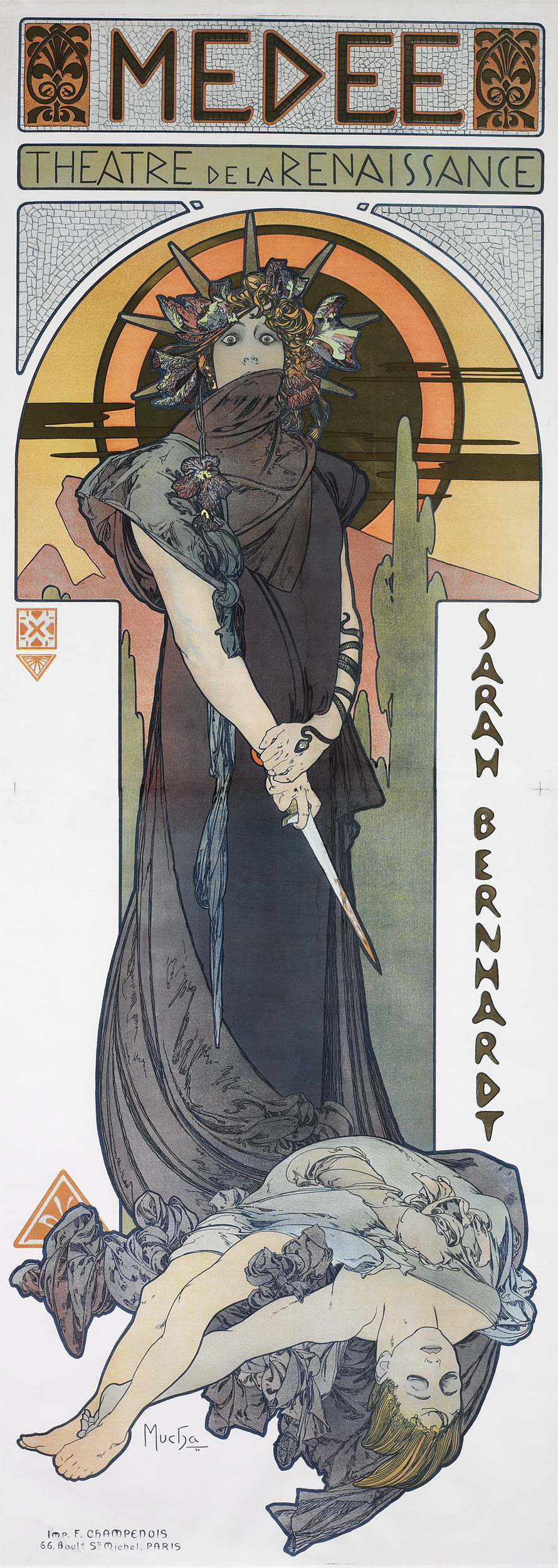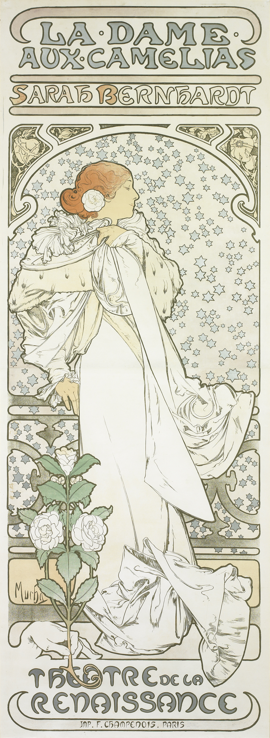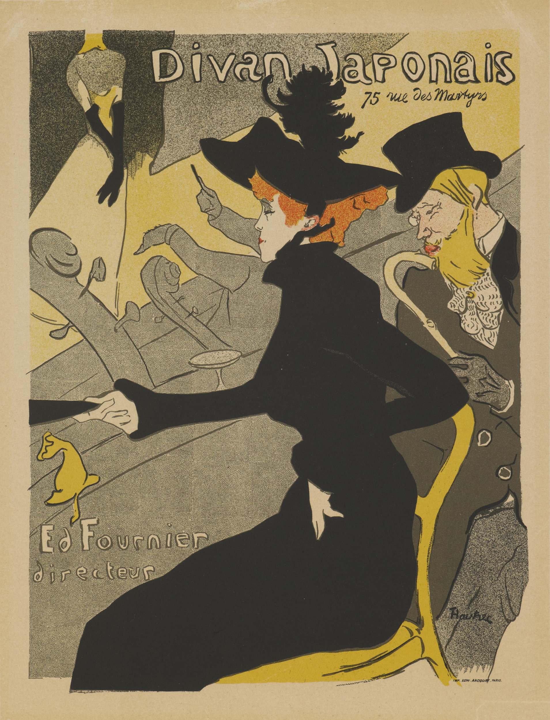 If Montmartre represented the city’s working class and bohemian energies, venues in central Paris had long served the middle and upper classes. In “Chanteuse de café-concert (The Café-Concert Singer)” (1875–76), Edgar Degas captures a white-gloved Emélie Bécat at the Café aux Ambassadeurs, near the entrance to the Champs-Elysées. Édouard Manet’s “Lola de Valence” (1862–63) depicts the visiting Spanish dancer while Alphonse Mucha’s posters for “The Divine” Sarah Bernhardt immortalized the actress’s tenure at the Théâtre de la Renaissance.