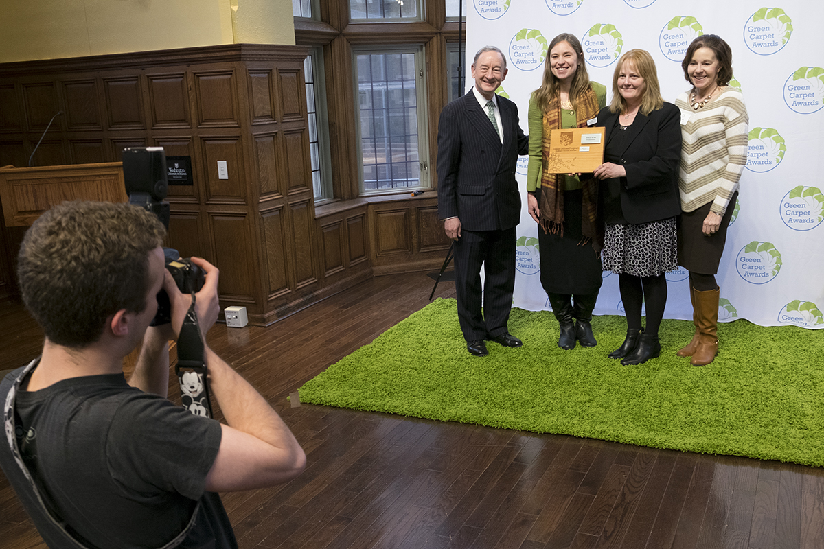 Staff from across Washington University in St. Louis gathered for the 2017 Green Carpet Awards, recognizing offices certified by the university’s Office of Sustainability, for lunch and awards on the green carpet in Umrath Lounge. (Photo: Sid Hastings/Washington University)