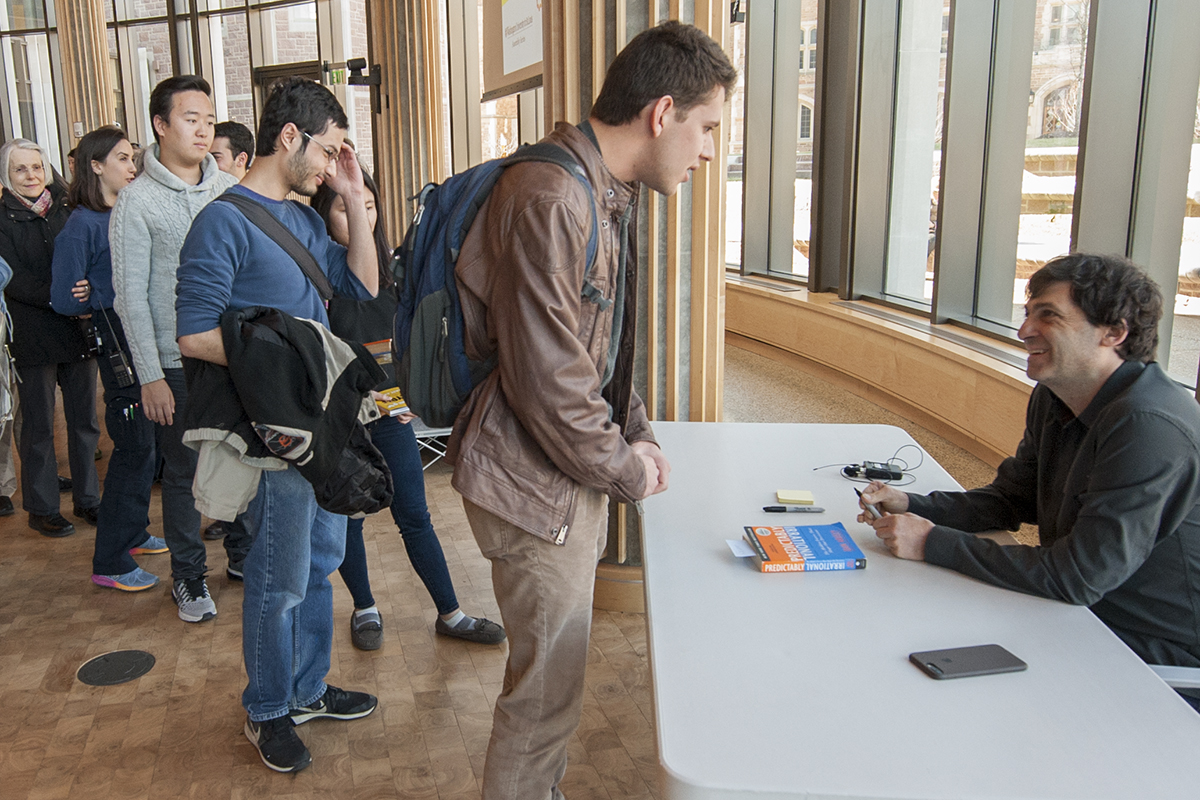 Dan Ariely signs a book for student Grant Black (left), a junior in Arts & Sciences, after giving a lecture on “The Art and Science of Self-Control” for the Assembly Series Feb. 2 in Hillman Hall. (Photo: Joe Angeles/Washington University)