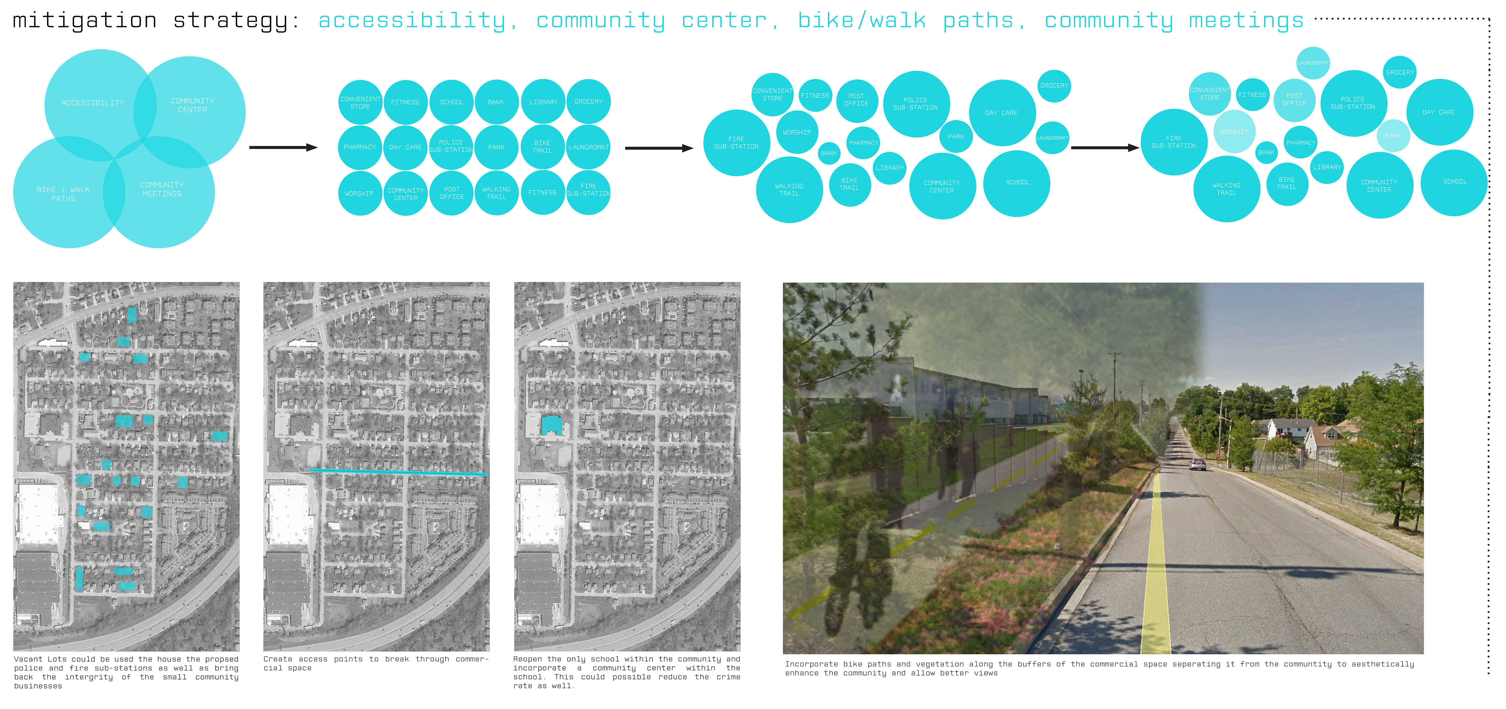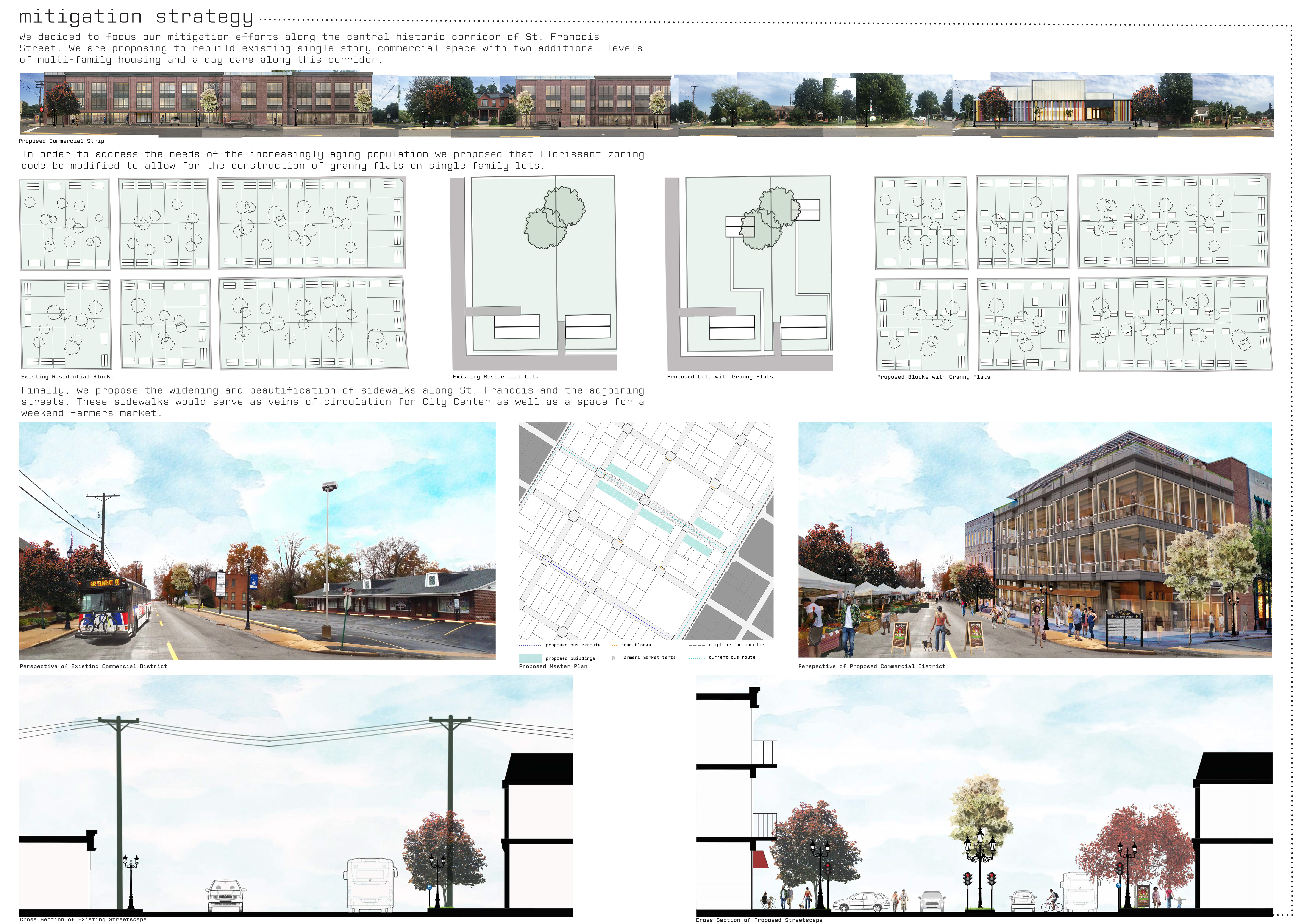 City Center was developed as a post-war working-class community. But as homeowners pass away or move into retirement communities, properties fall into the hands of absentee landlords or become vacant. To attract younger residents, our team proposed a denser, more active commercial district along St. Francois Street, the community’s main corridor, as well as strategies that would allow seniors to “age in place” while increasing home ownership among current renters.
