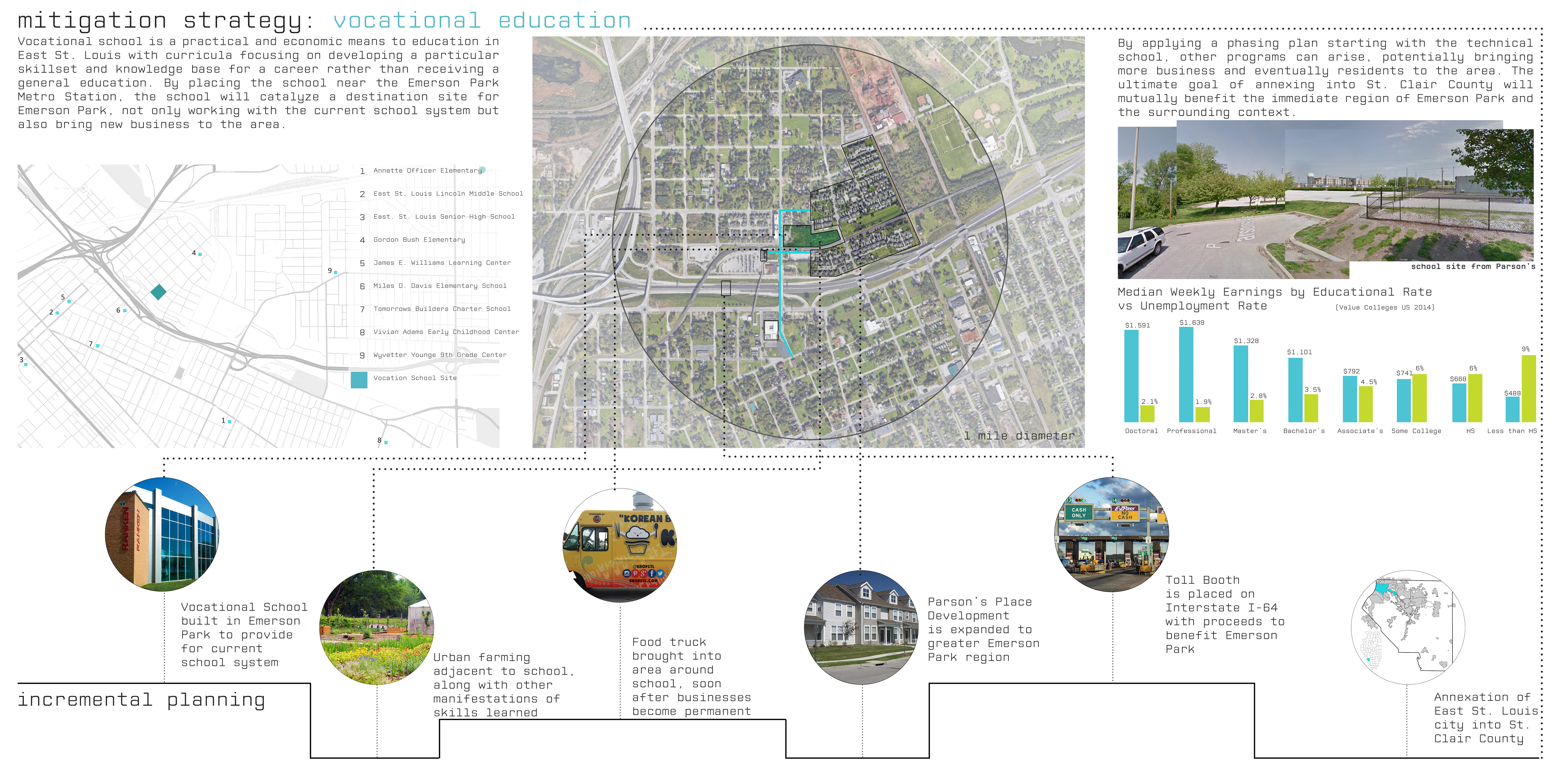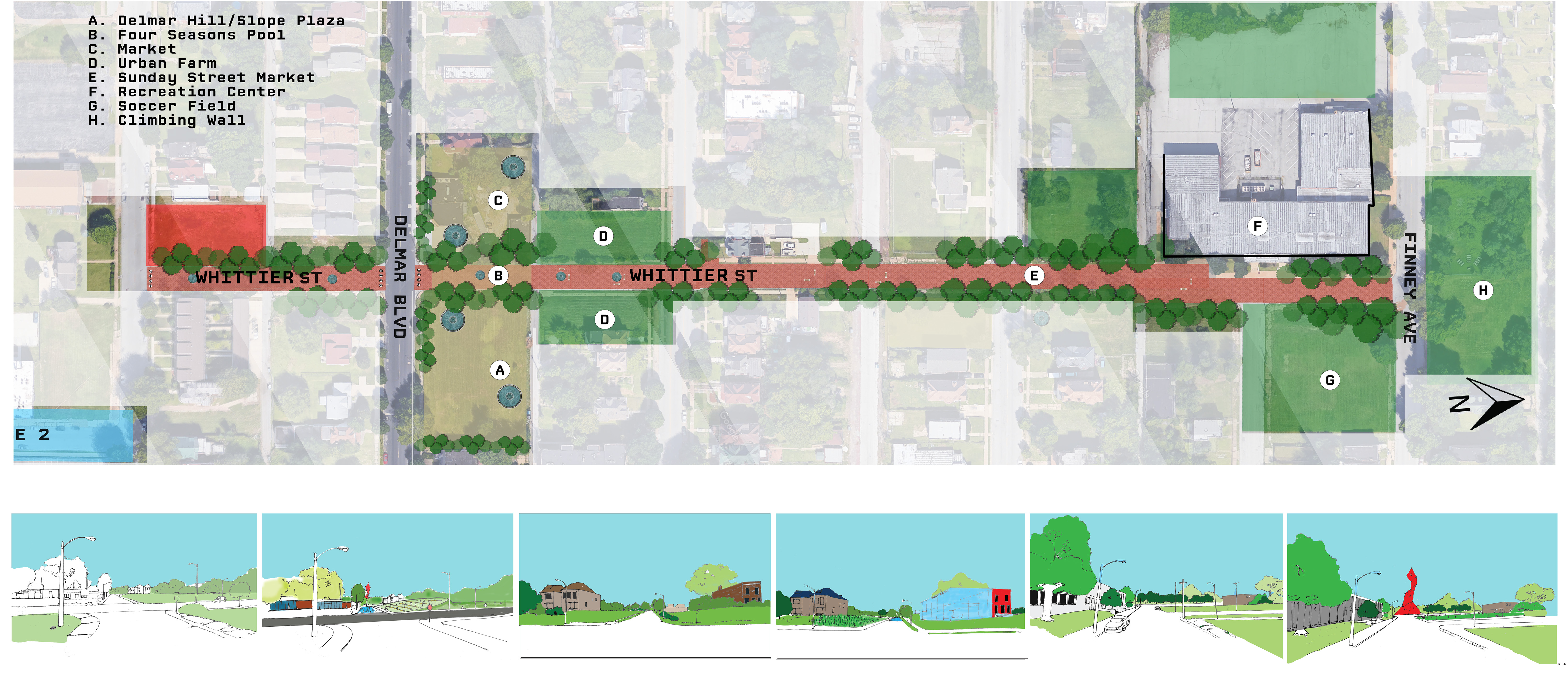 In addition to Meacham Park, students worked with professional mentors to develop plans for the city’s Central West End, Tower Grove South and West End neighborhoods, as well as for City Center in Florissant and Emerson Park in East St. Louis. Can you give examples of specific issues or conditions they addressed?