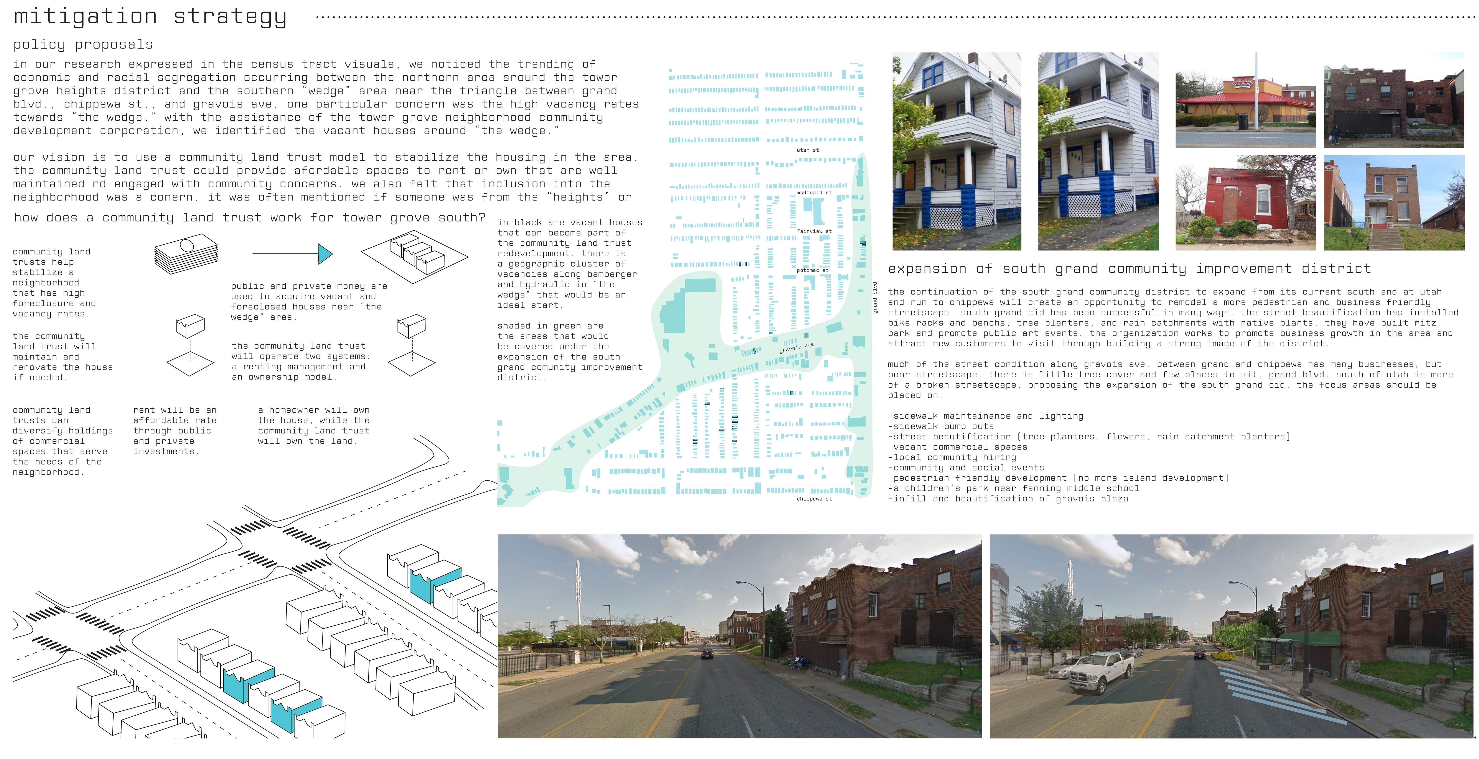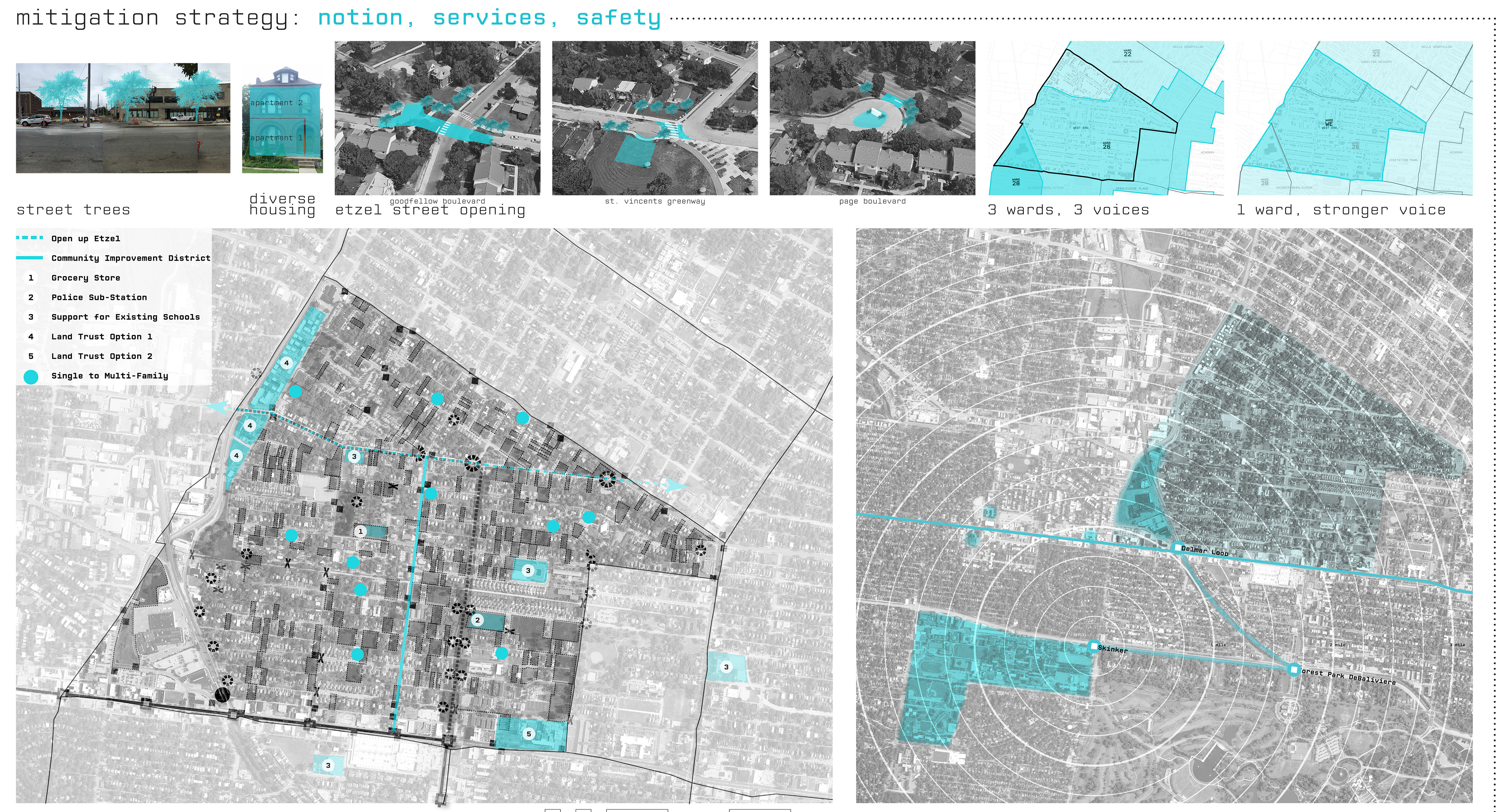 The once-prosperous West End, located between Delmar and Page, experienced a very traumatic racial transition in the 1950s and ’60s. Though recent years have brought an influx of affluent whites, the West End still suffers from high rates of poverty, chronic disease and crime. The challenge confronting our team was to develop a mitigation plan that would maintain revitalization momentum without leading to gentrification and displacement.