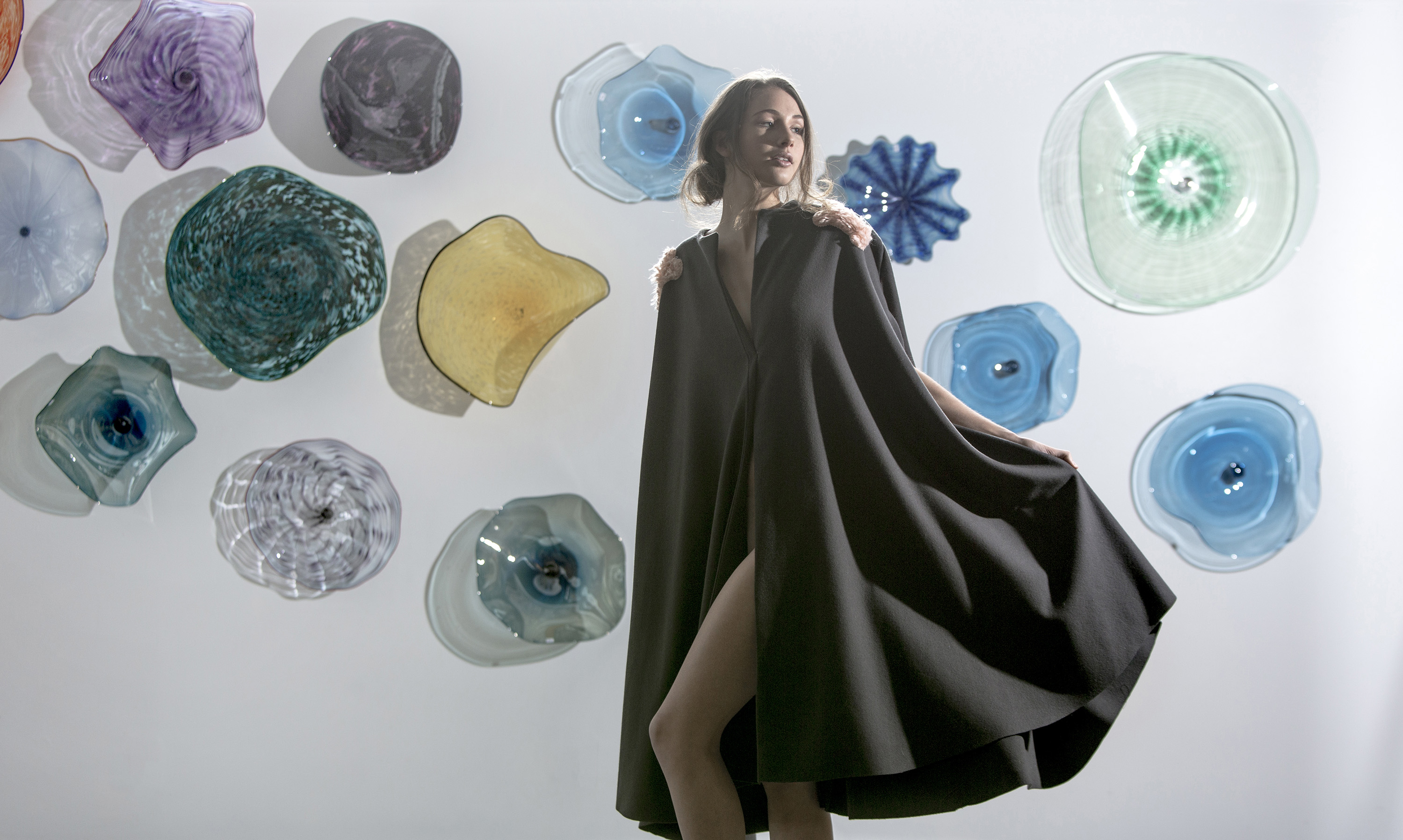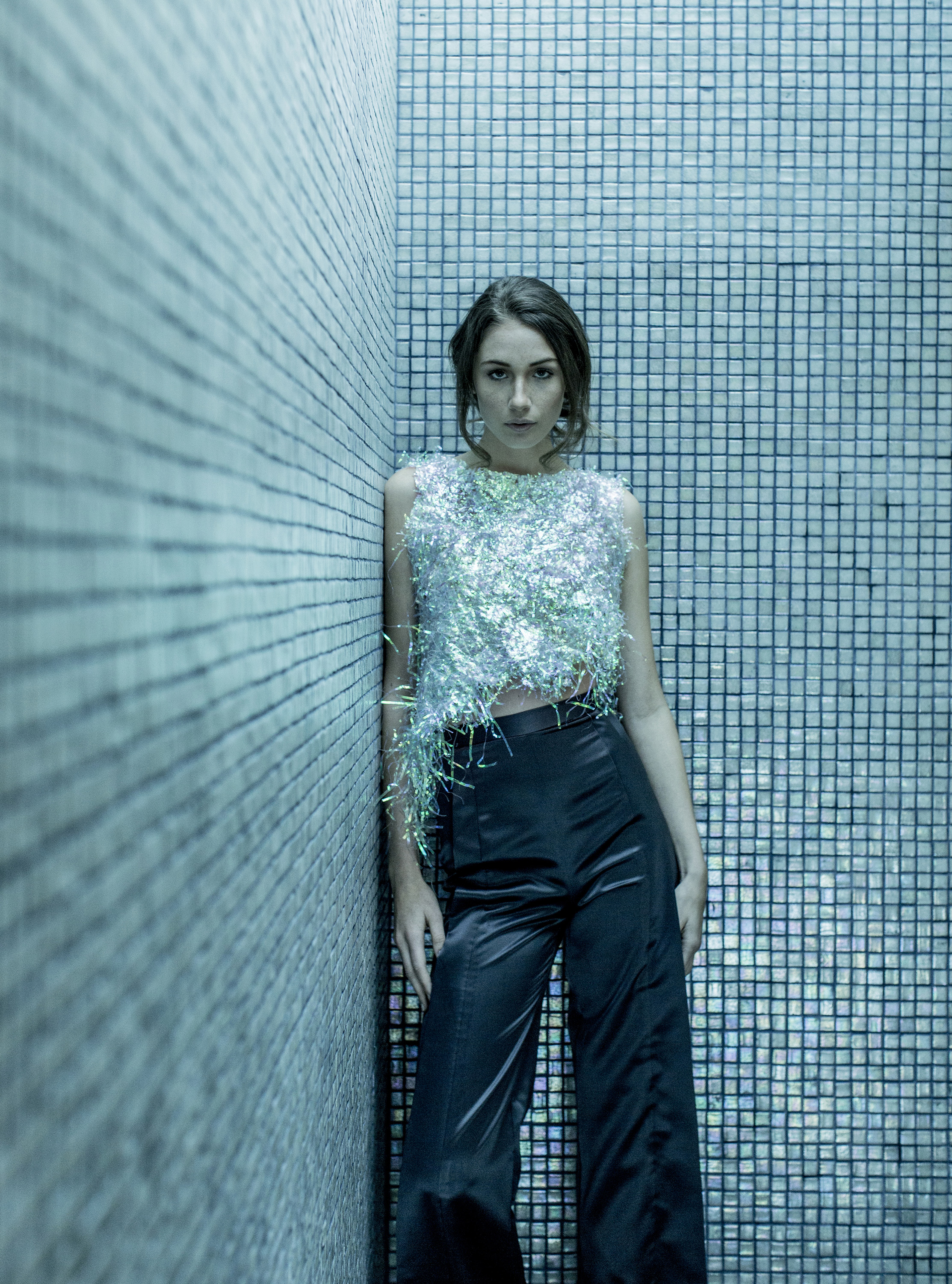 The show will highlight the seniors’ thesis collections. Helen Kwon, for example, offers a contemporary take on the Hanbok, a traditional Korean dress. Inspired by light spilling through an airplane window shade, Kwon’s sleekly shimmering collection features a unique iridescent fabric she crafted from commercial confetti.