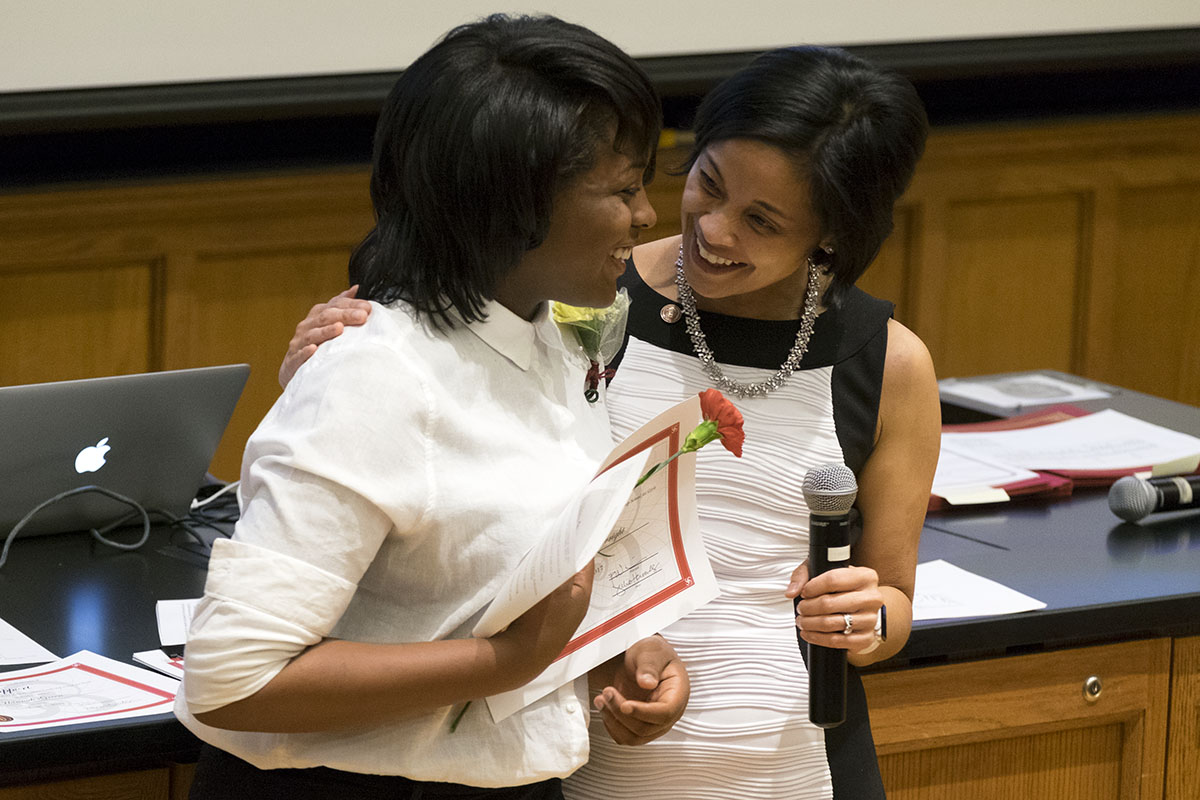 Robyn Wiens (right), principal at Hawthorn, proudly presents an award to student Trezhure Cartwright at the “rising up” ceremony held at Washington University June 1. (Photo: Sid Hastings/Washington University)