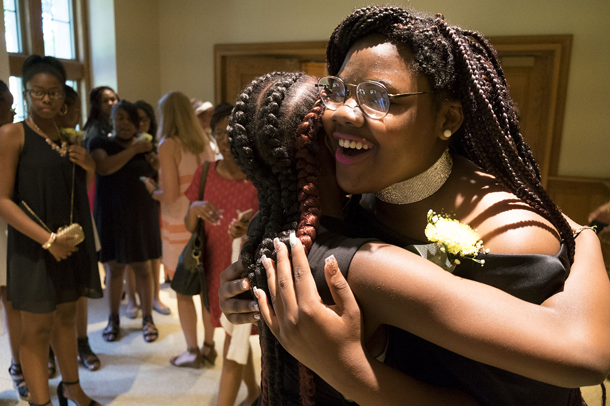 Student Jayla Gordon-Spraggins of the Hawthorn Leadership School for Girls embraces a classmate at the school’s first eighth grade “rising up” ceremony, held June 1 in the Lab Sciences Building at Washington University. Hawthorn, Missouri’s first single-sex charter school, was founded in 2014 by Washington University trustee Mary Danforth Stillman. Hawthorn is one of five charter schools sponsored by Washington University. (Photo: Sid Hastings/Washington University)