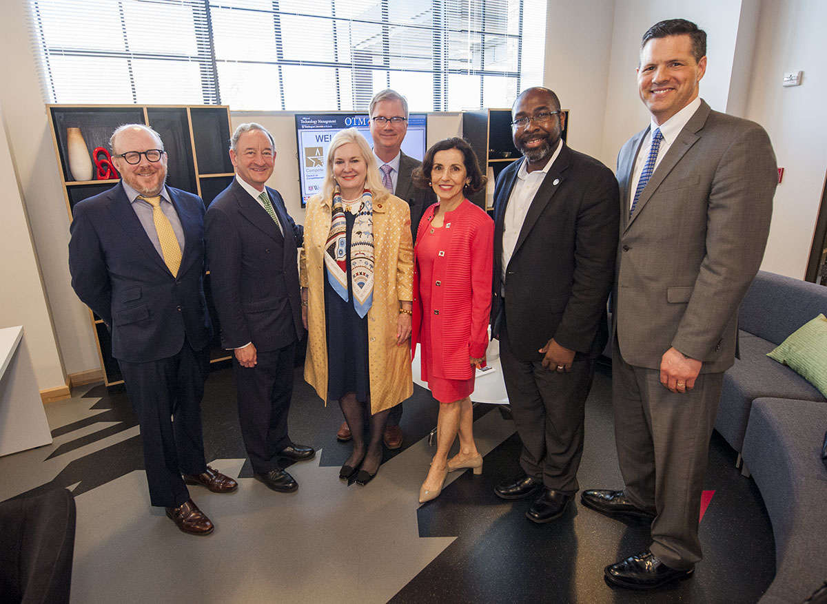 The Exploring Innovation Frontiers Initiative, a national effort to support and advance innovation in the United States, held a conference June 6 at the university’s Office of Technology Management. (From left) Chad Evans, of the Council on Competitiveness; university Chancellor Mark Wrighton; Deborah Wince-Smith, president/CEO of the Council on Competitiveness; university Provost Holden Thorp; France Cordova, director of the National Science Foundation; Dedric Carter, vice chancellor for operations and technology transfer at the university; and Brian Stone, Cordova’s chief of staff, stand together at the conference. (Photo: Joe Angeles/Washington University)