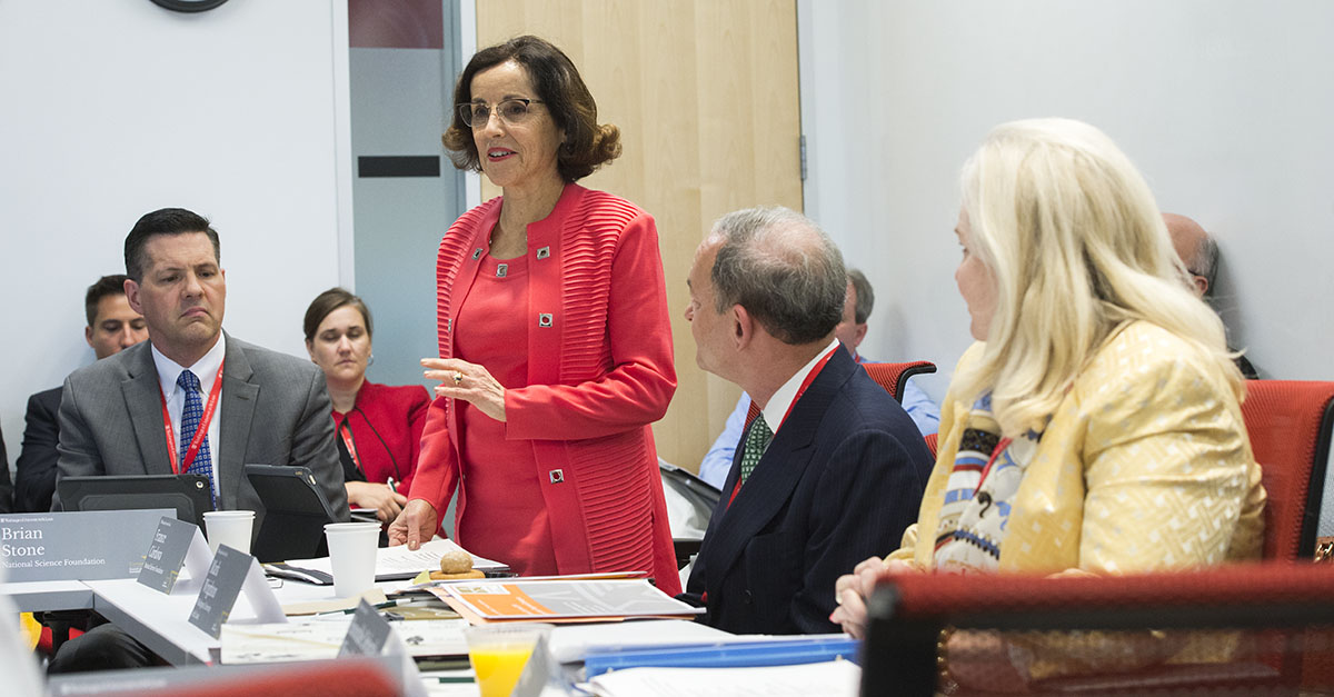 France Cordova, director of the National Science Foundation (center), speaks to those gathered at the Exploring Innovation Frontiers Initiative conference June 6. (Photo: Joe Angeles/Washington University)