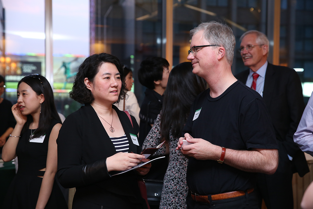 Jiayuan Li (left), an alum living in Shanghai, visits with university Provost Holden Thorp. Thorp, along with Jeffery Matthews, professor in the Performing Arts Department, led the “We Are Family” musical review group, which performed for a crowd of alumni and friends in Shanghai May 25 and in Beijing May 28. (Photo by Zengyuan Zhang)