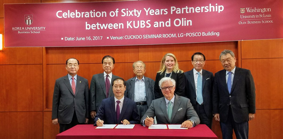 Olin Business School Dean Mark Taylor (front row, right) helps celebrate the business school’s 60-year partnership with the Korea University Business School in June. (Courtesy photo)