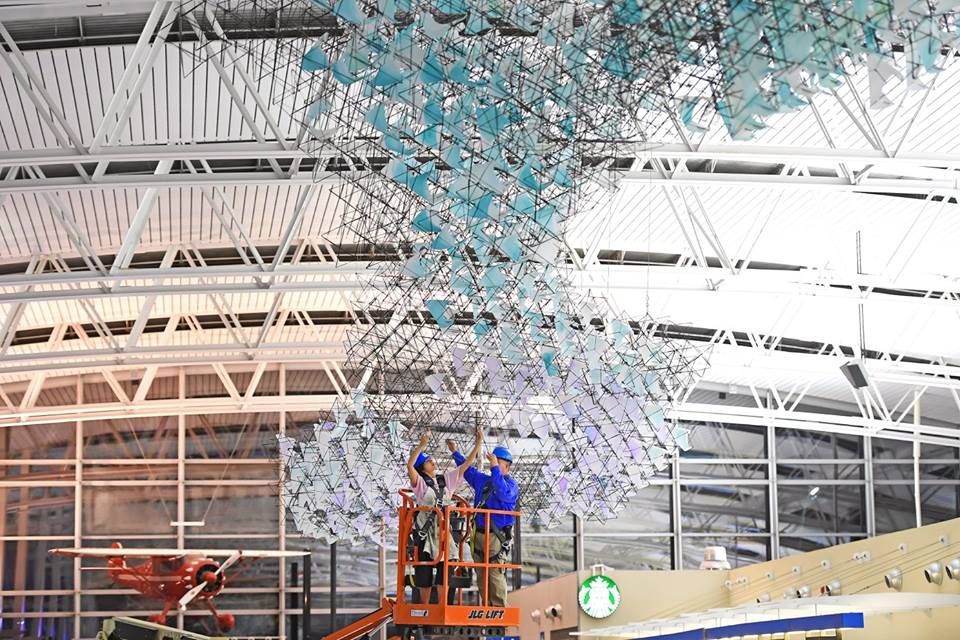 Sam Fox School architecture students have worked for months to design and build a 100-foot-long public sculpture, “Spectroplexus.” The work was installed this month in Terminal 2, above the ticketing lobby, at St. Louis Lambert International Airport. See more images on the Sam Fox Facebook page. (Photo: James Byard/Washington University)