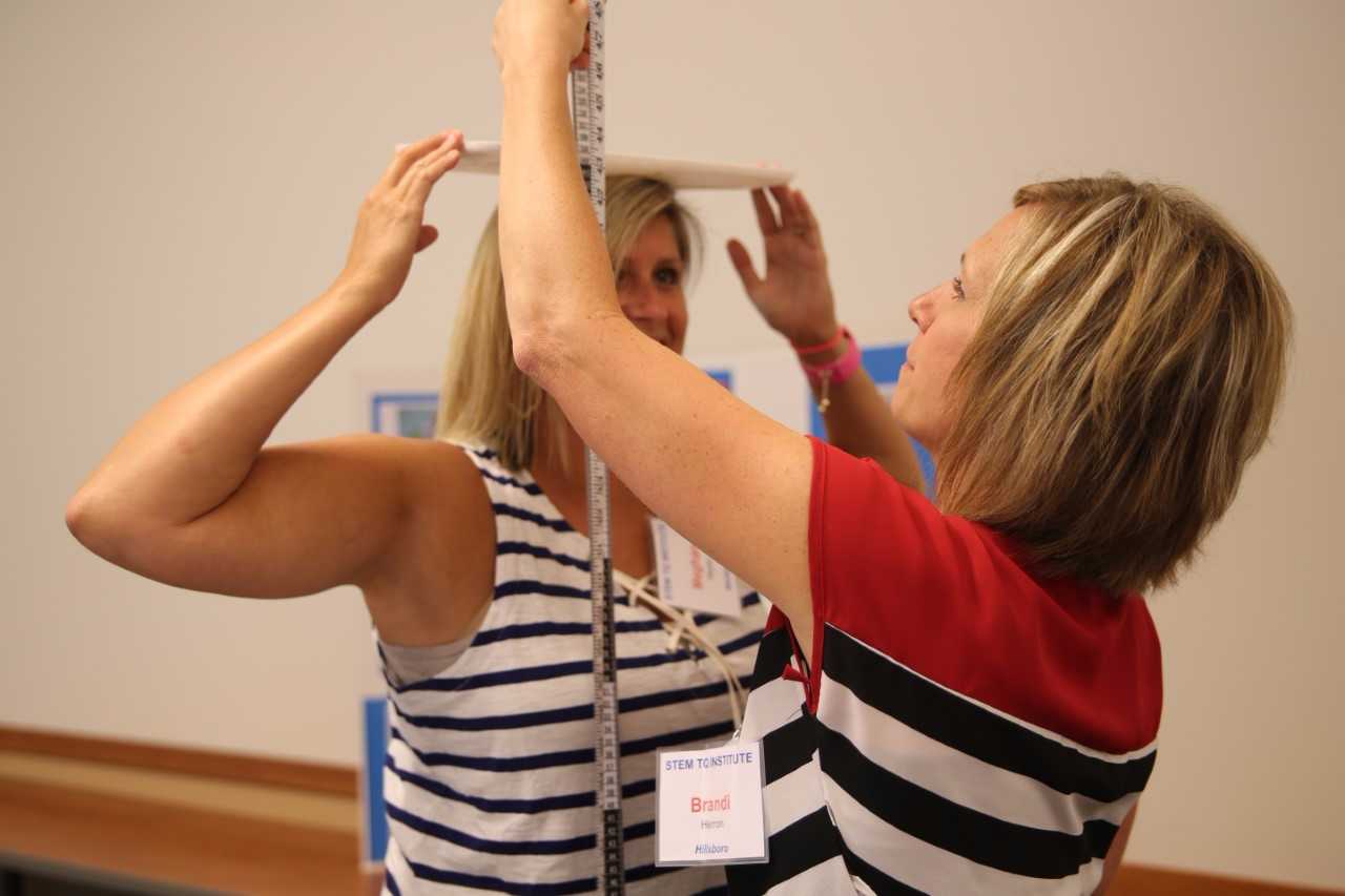 Brandi Herron, a fourth-grade teacher at Hillsboro Elementary School, and Meghan Hayes, a second-grade teacher at Peine Ridge Elementary in the Wentzville School District, measure each other during the bones and ratios session July 18, 2017, as part of the STEM Teacher Quality (STEM TQ) Institute. Hosted by Washington University’s Institute for School Partnership, the two-week summer institute helps elementary teachers teach STEM. (Photo: Myra Lopez)