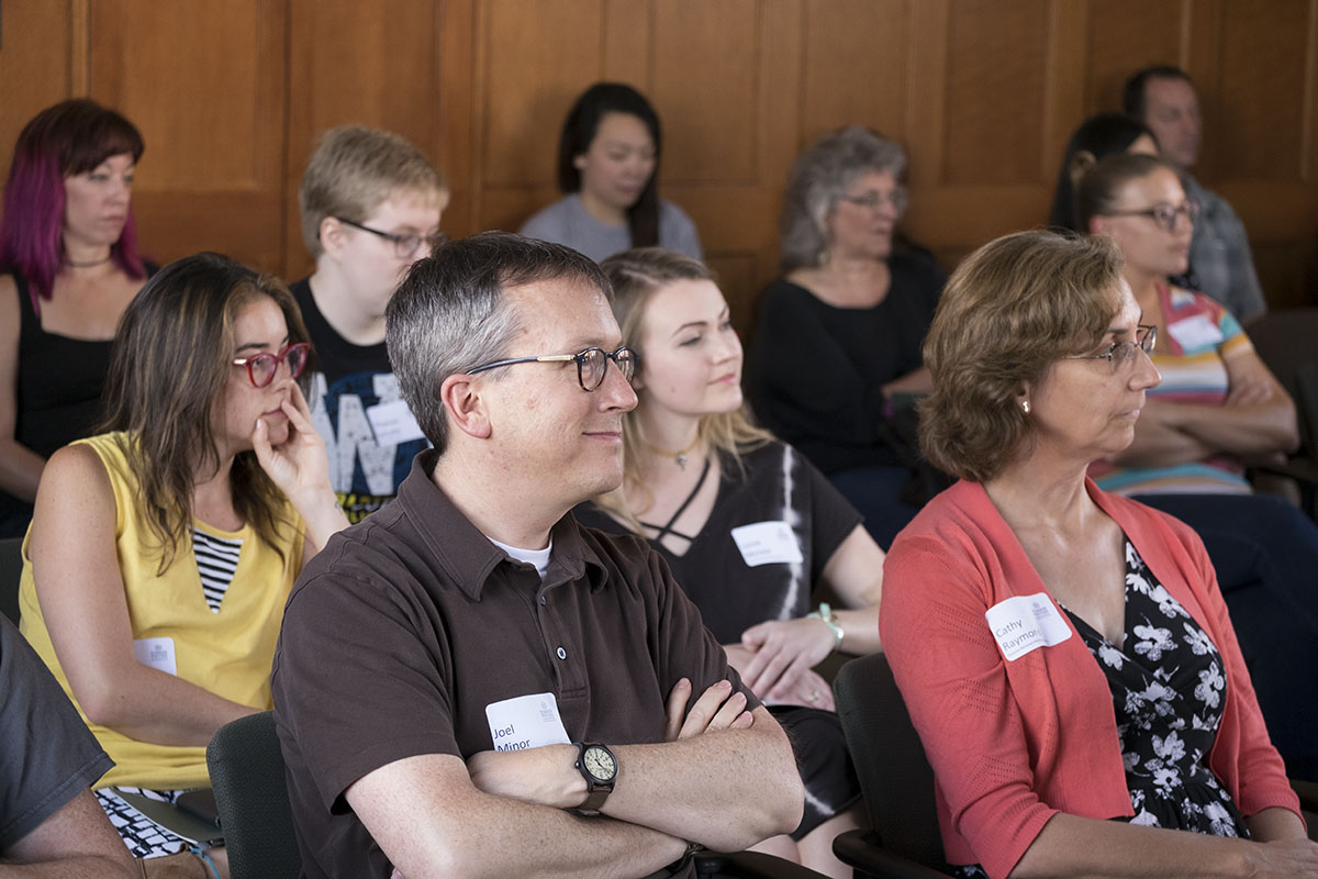 Participants in the university’s 2017 Summer Writers Institute gathered for an opening reception July 14 in Duncker Hall on the Danforth Campus. (Photo: Sid Hastings/Washington University)