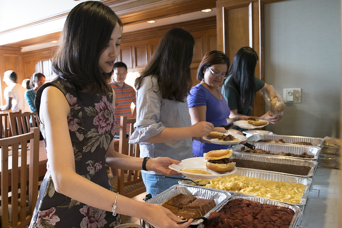 Participants in the university’s 2017 International Summer Study program gathered for a welcoming dinner with American fare at Lopata House on July 14. (Photo: Sid Hastings/Washington University)