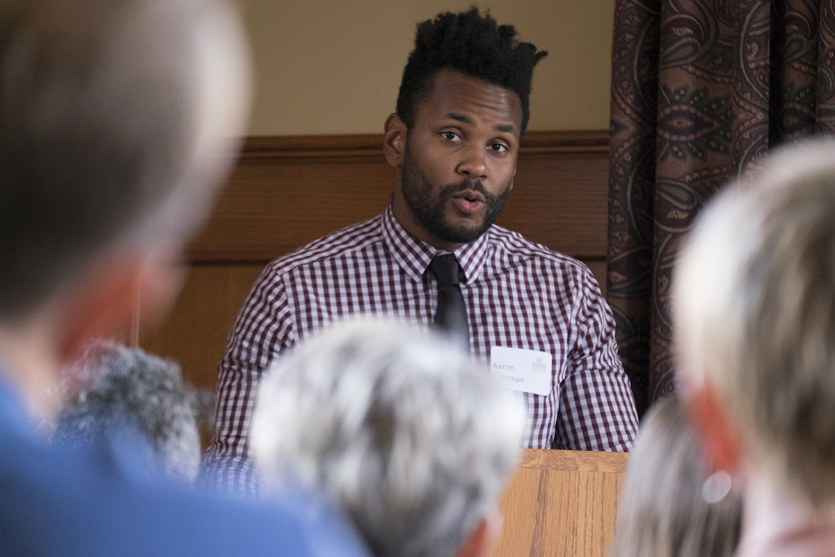 Author Aaron Coleman, a Chancellor’s Graduate Fellow in the university’s comparative literature PhD program, delivered the keynote address at the 2017 Summer Writers Institute opening reception July 14 in Duncker Hall. (Photo: Sid Hastings/Washington University)