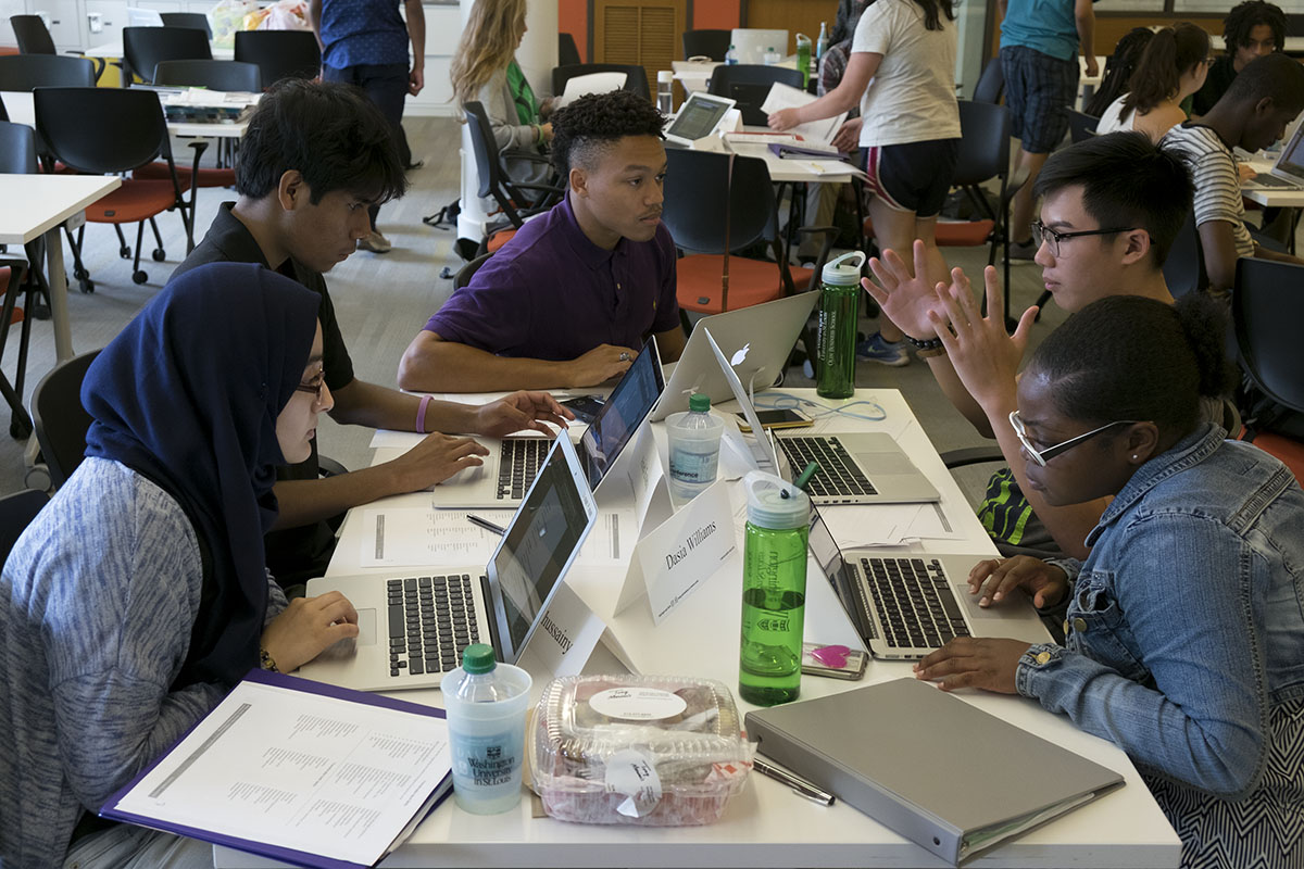 As part of the Olin Fleischer Scholars Program, high school students participate in a collaborative workshop on resumes. (Photo: Sid Hastings/Washington University)