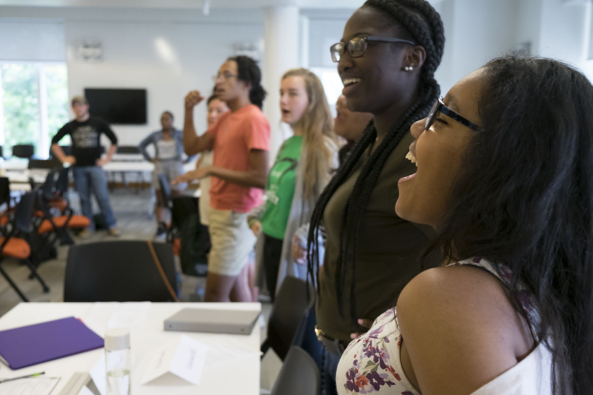 The inaugural cohort of the Olin Fleischer Scholars Program, a week-long residential summer program for high school students geared toward underrepresented and first-generation college student populations, spent one week on campus learning about various business careers, meeting Olin faculty, and visiting with St. Louis business leaders and WashU business alumni. Briana Amador (right) joined others July 26 in an ice-breaking name game. (Photo: Sid Hastings/Washington University)