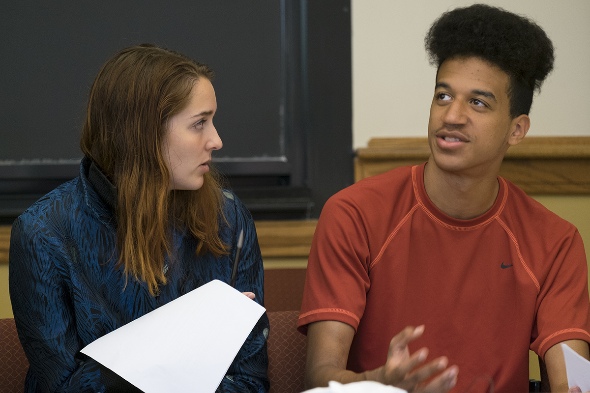 Students enrolled in the “Design Thinking” class at Washington University have their projects critiqued in the Lab Sciences Building Aug. 9, 2017. The class was examining design ideas to improve air travel. Here, student Kae Schwalber (left) talks with classmate Andre Henry. (Photo: Sid Hastings/Washington University)