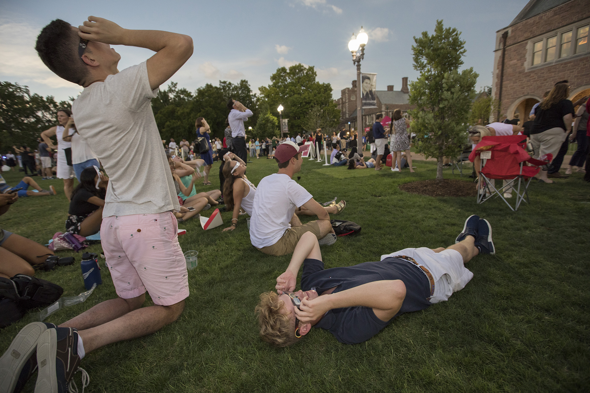 People take in the spectacle of the solar eclipse Aug. 21 on Mudd Field. Laying on the ground at right is Spencer Stewart, a first-year student from Lexington, Ky. (Photo: Joe Angeles/Washington University)