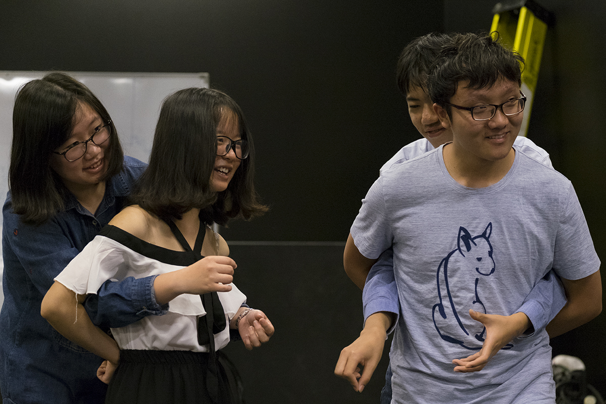 Washington University students enrolled in “Improvisation for the Actor” participate in team presentations during class at the Casper Lighting Lab in Mallinckrodt Center Aug. 11, 2017. (Photo: Sid Hastings/Washington University)