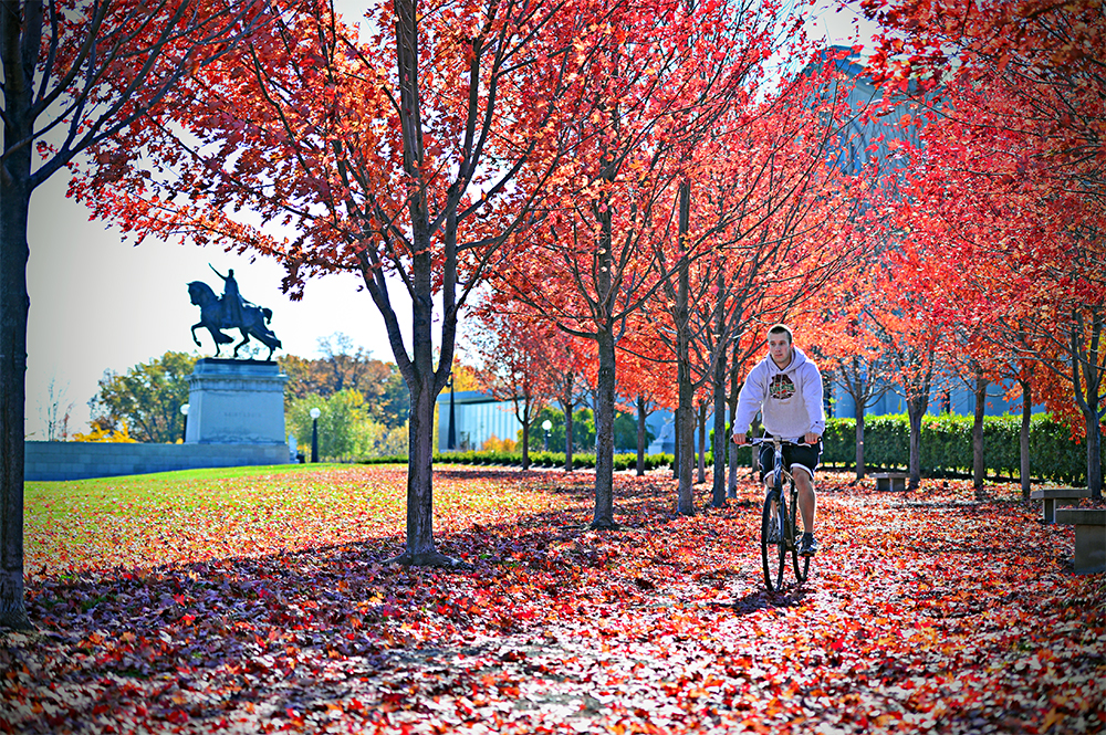 “There’s a skating rink, museums, a zoo, an outdoor musical theater and restaurants” in Forest Park, the survey noted. Not to mention gorgeous scenery year-round. Here, a Washington University student rides through falling leaves in autumn. (Photo: James Byard/Washington University)