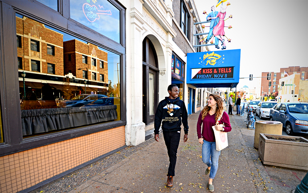 “Plus — the restaurants.” The survey calls out the “variety of new independent eateries” as part of what makes St. Louis great. Washington University students enjoy a walk along the Delmar Loop, close to campus and filled with culinary options. (Photo: James Byard/Washington University)