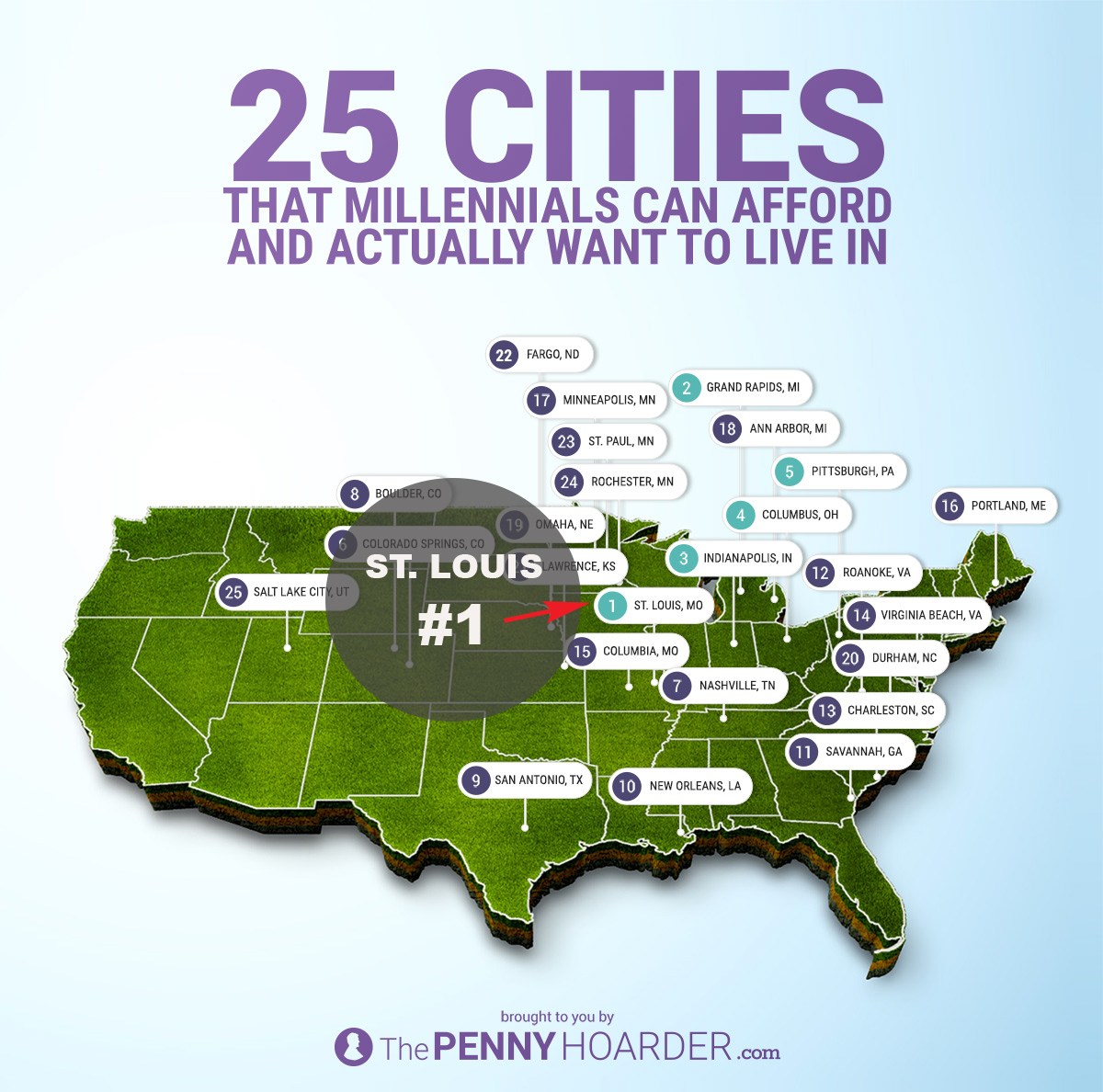 The survey celebrates cities where young people “can actually find work and afford a one-bedroom apartment, but also find a new brewery or wine bar on weekends.” Source: The Penny Hoarder