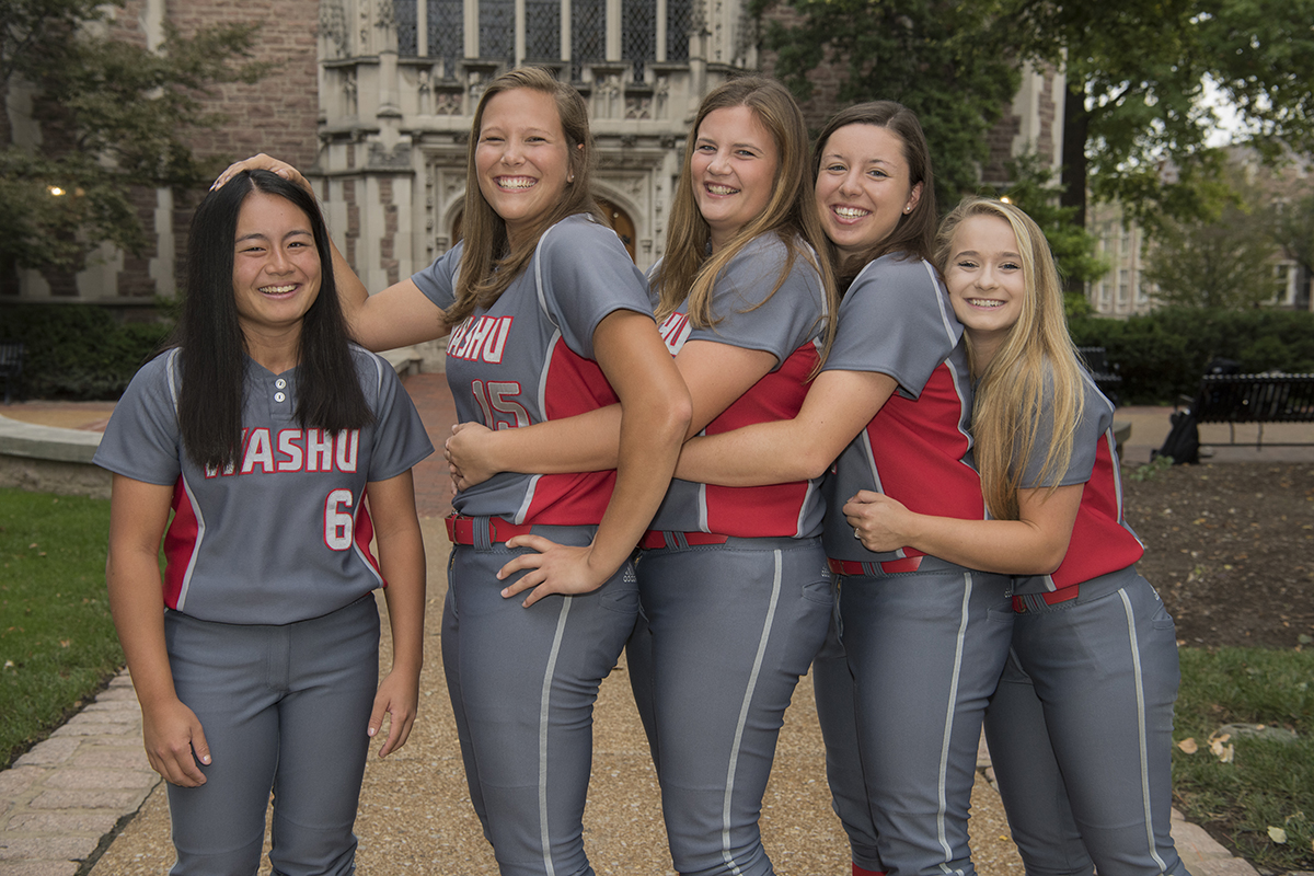 Members of the Washington University softball team pose in front of Graham Chapel Oct. 6 during their team photo day. (Photo: Mary Butkus/Washington University)