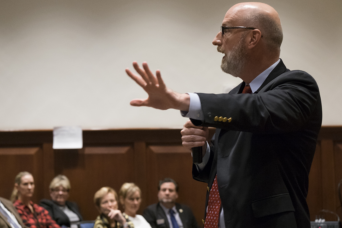 David French, senior fellow at the National Review Institute (NRI), delivered an Oct. 11 Assembly Series lecture, titled “War of Words: Free Speech versus Tyranny on Campus.” View the lecture, which was also sponsored by the School of Law, the Show-Me Institute and the NRI. (Photo: Sid Hastings/Washington University)