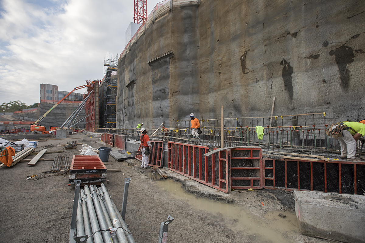 Construction crews work on the 40-foot wall of the garage being built on the east end of the Danforth Campus Oct. 13. (Photo: Joe Angeles/Washington University)