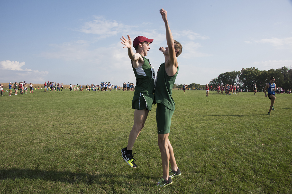 Cross-country athletes celebrate during the Principia College Cowbell Classic on Oct. 14 in Elsah, Ill. The Bears men’s and women’s teams both placed fifth overall in the classic. (Photo: Mary Butkus/Washington University)
