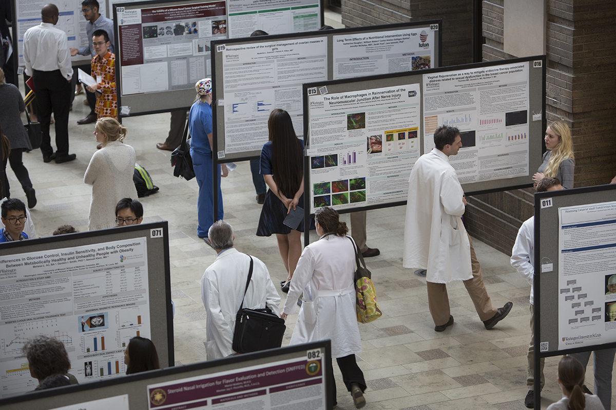 People on the Medical Campus check out the School of Medicine’s 12th Annual Research Training Symposium and Poster Session. Amy Justice, MD, PhD, professor at Yale University, delivered the keynote address. (Photo: Karen Elshout/Washington University)