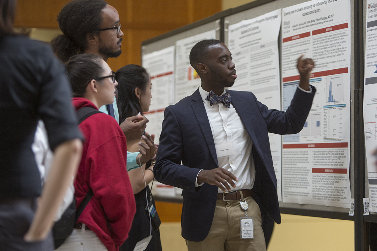 The School of Medicine’s 12th Annual Research Training Symposium and Poster Session had over 200 attendees, five oral presenters and 113 posters from 23 programs. Here, Amal Taylor, a second-year medical student in the 2017 Summer Research Program, talks with other students. (Photo: Karen Elshout/Washington University)