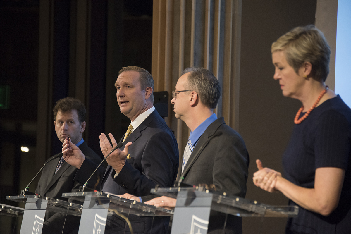 Chris Preble, of the Cato Institute, talks during a debate about the country’s role on the international stage, organized by the Brookings Institution and the Charles Koch Institute and held on campus Nov. 6. (Photo: Mary Butkus/Washington University)
