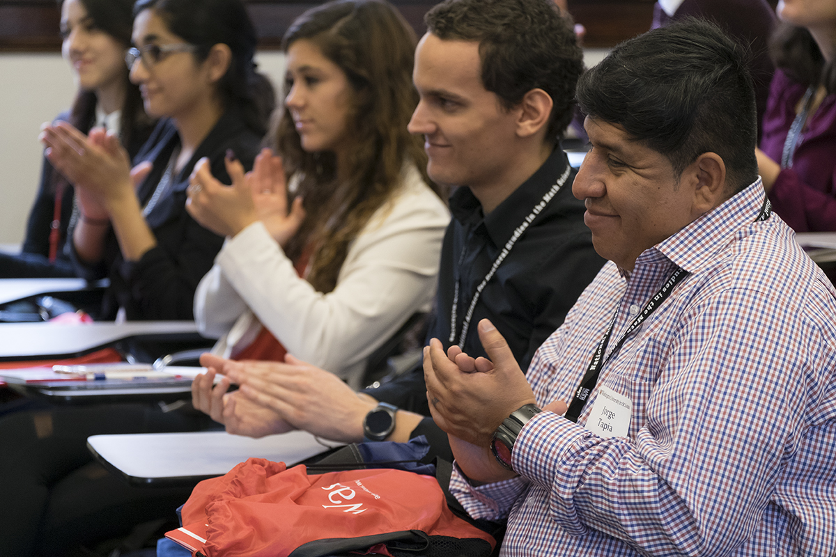 Jorge Tapia (right) and others participants in the 2017 Field of Dreams Conference paid a visit to the Danforth Campus Nov. 3. Students heard from Washington University faculty and staff about the process and requirements for graduate school in mathematics and related fields. (Photo: Sid Hastings/Washington University)