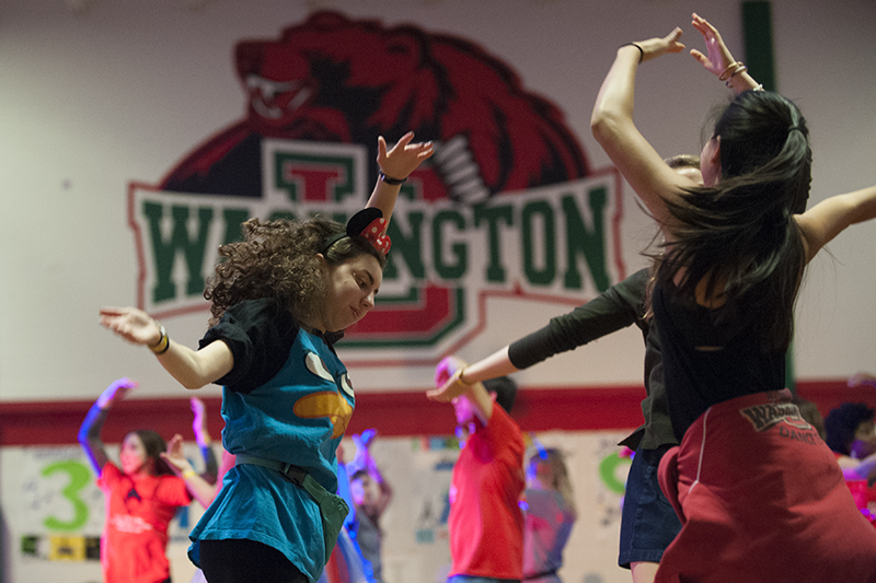 Washington University students, including Rachel Ockner (left), Claire Quinlan and Marisa Gong (back to camera), gathered Nov. 4 for the school’s annual Dance Marathon, a fundraiser for Children’s Miracle Network Hospitals of Greater St. Louis, in the Athletics Complex. (Photo: Sid Hastings/Washington University)