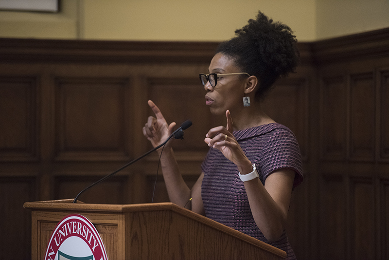Historian Crystal Feimster, of Yale University, delivered an Assembly Series talk Nov. 8 about the 1917 race riots in East St. Louis, Ill., and black women’s role in the struggle for racial equity. (Photo: Mary Butkus/Washington University)