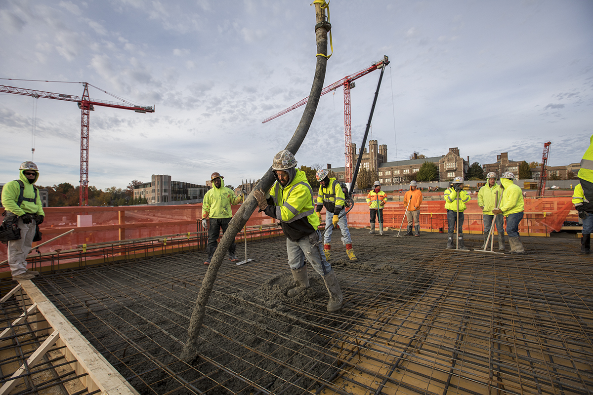 Workers pour concrete Nov. 10 for the main floor of Jubel Hall at the east end construction site. (Photo: Joe Angeles/Washington University)