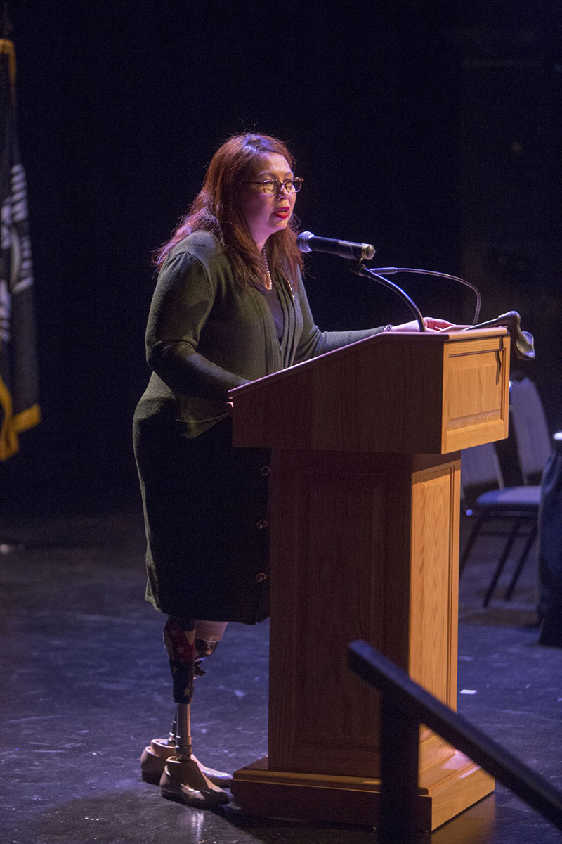 U.S. Sen. Tammy Duckworth speaks Nov. 10 during the Veterans Day Celebration at Washington University’s Edison Theatre.