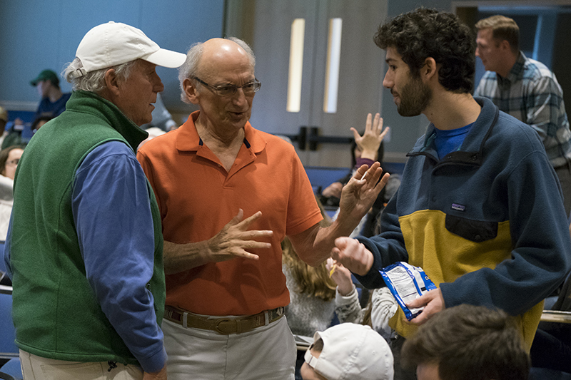 Arthur Culbert (left) talks with Edmund O. Acosta and first-year student Rob Haber during a break in the class “When I’m 64: Transforming Your Future,” which is co-taught by Brian Carpenter, of Arts & Sciences, Nancy Morrow-Howell, of the Brown School, and Susy Stark, of the School of Medicine. Culbert and Acosta are two of 15 members of STL Village who are taking the course along with students, offering them a real-world perspective on issues of aging and changing demographics. (Photo: Sid Hastings/Washington University)