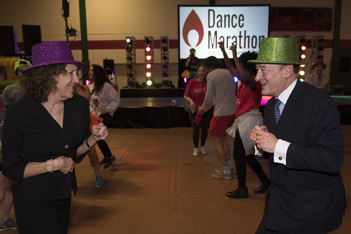 Chancellor Mark S. Wrighton and his wife, Risa Zwerling Wrighton, join in with Washington University students gathered Nov. 4 for the 12-hour Dance Marathon to raise money for local children’s hospitals. (Photo: Sid Hastings/Washington University)