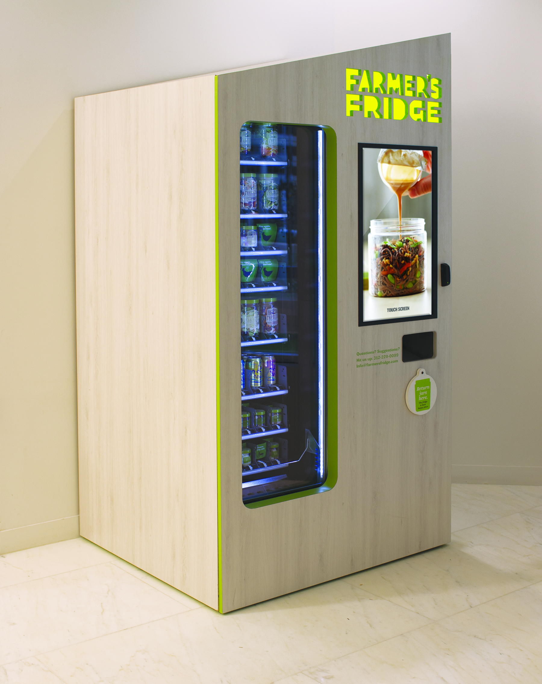 Enter Farmer’s Fridge, which sells fresh food like kale chicken Caesar salad, soba noodles and crunchy Thai salad with coconut chicken from vending machines unlike any you’ve seen before. In fact, the company calls them fridges. They’re brightly lit and made of reclaimed alabaster wood, with slick modern touch-screen interfaces. Inside are rows of jars where the food is in colorful layers. It looks “the way fossils might look if the Earth had been created by meticulous vegans,” Olga Khazan wrote in a feature about Farmer’s Fridge in The Atlantic.