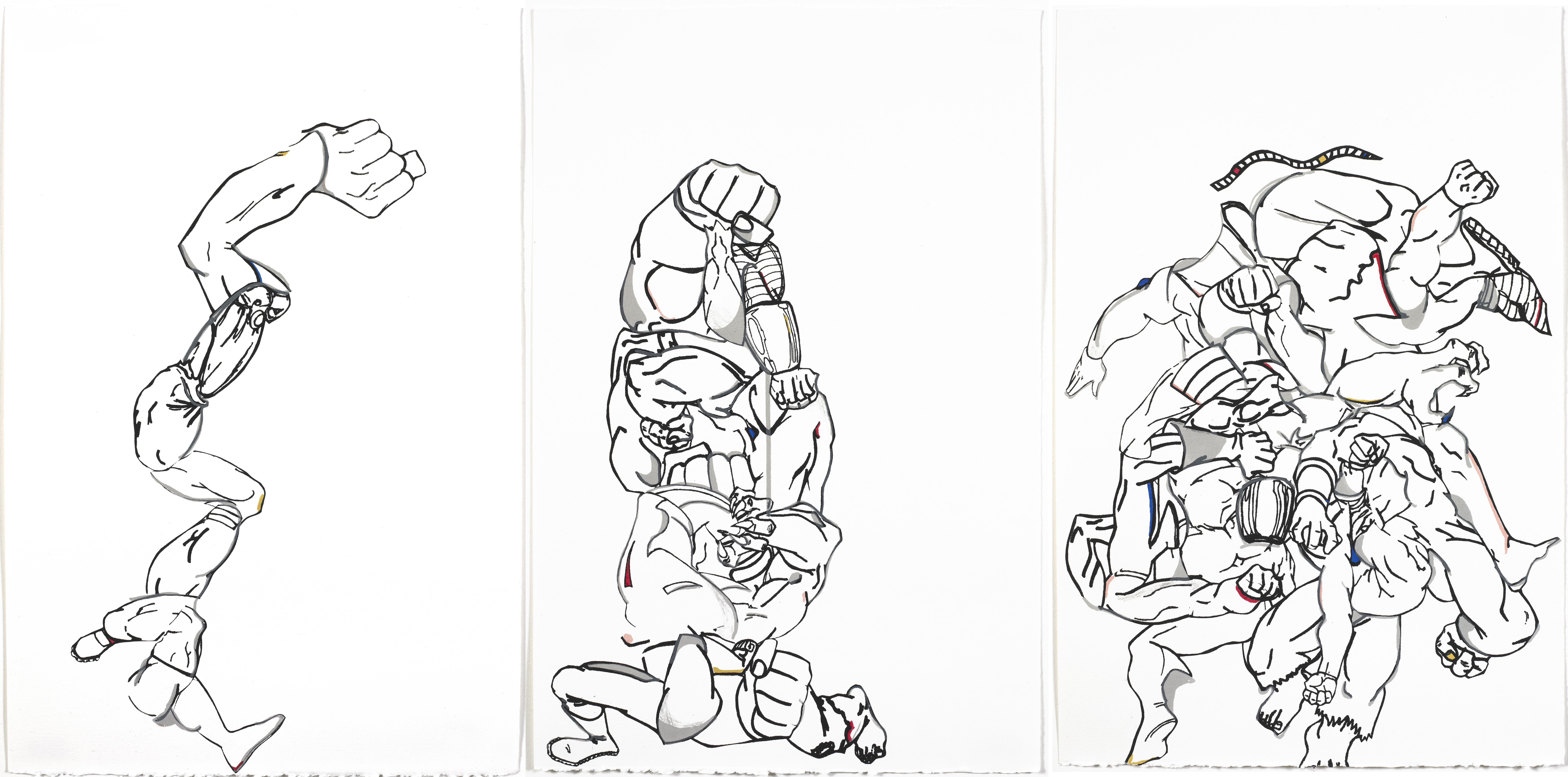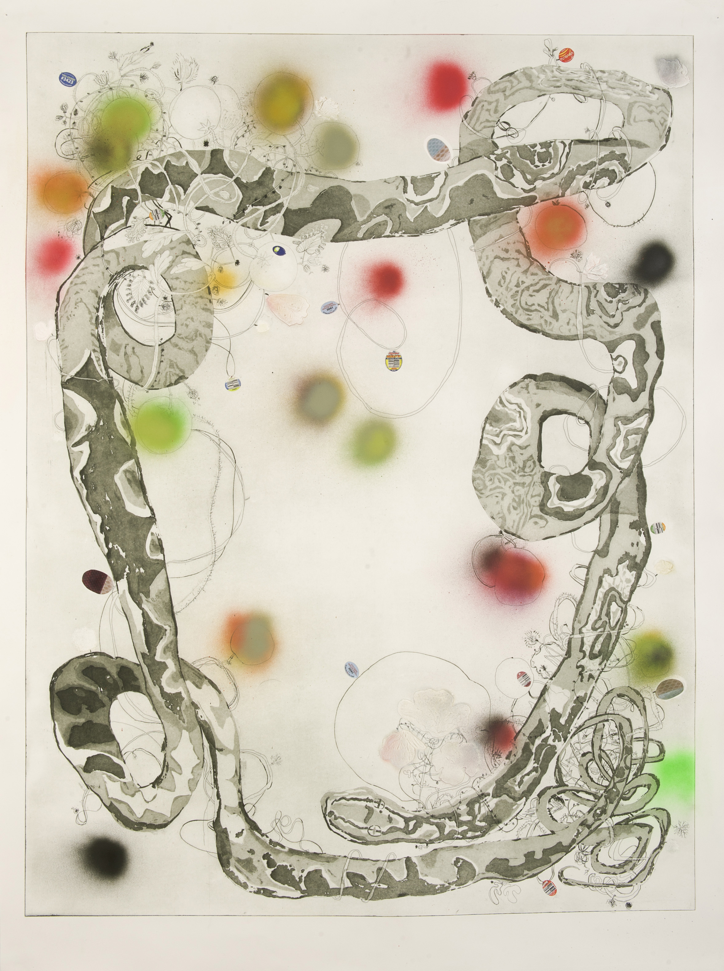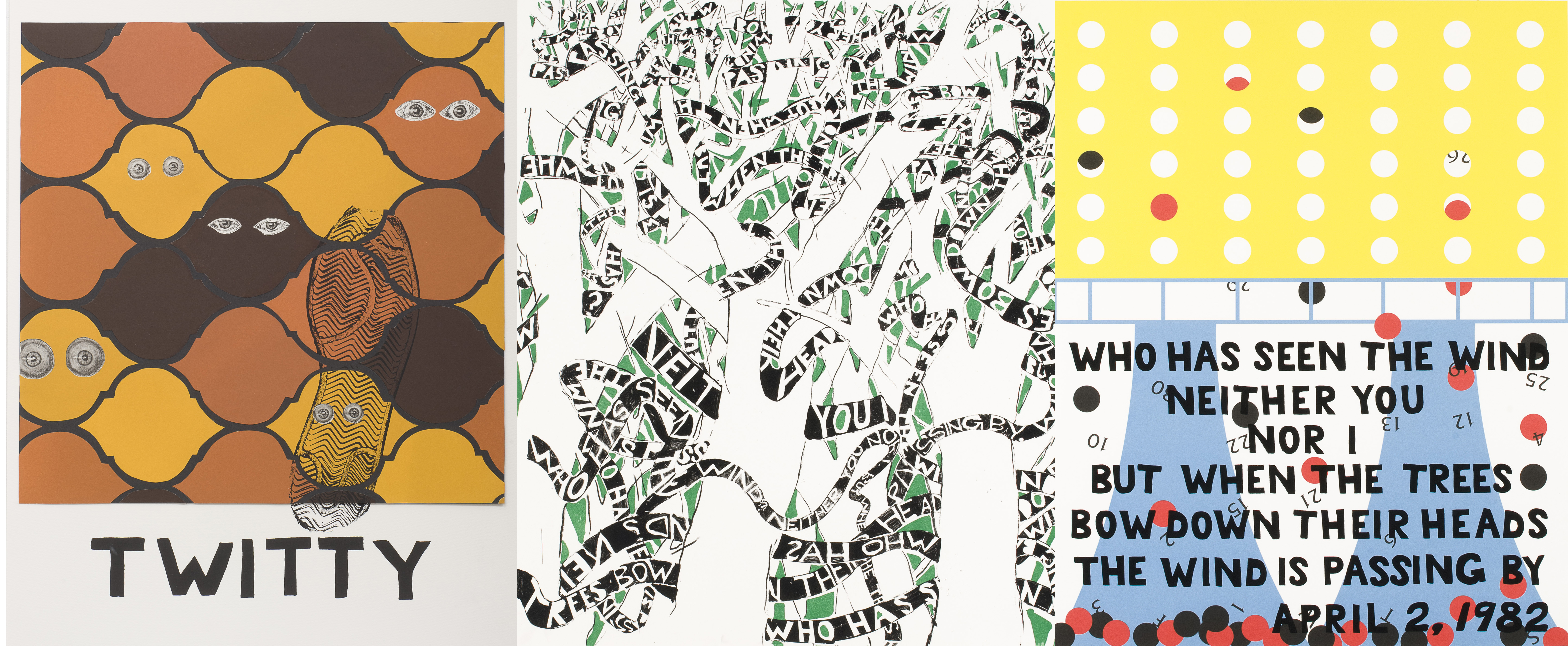 Radcliffe Bailey’s sepia-toned “Tricky 3” (2011) layers pigment printing, collagraph, collage and glitter to investigate themes of race, ancestry and personal history. Nina Katchadourian’s slyly humorous “Window Seat Suprematism” (2014) filters the Russian avant-garde through photographs of airplane wings taken during commercial flights. Trenton Doyle Hancock’s 16-print portfolio “548 First Street NE” (2013) deploys silkscreen, photogravure, lithography and etching to explore childhood memories of his grandmother’s home in Paris, Texas.