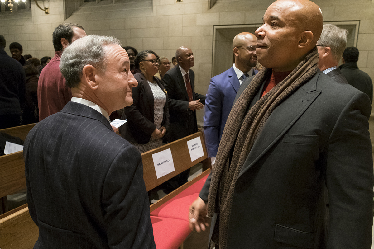 Chancellor Mark Wrighton (left) visits with James Clark, of Better Family Life, who received the Rosa L. Parks Award at the university’s annual Martin Luther King Jr. Commemoration Jan. 15 in Graham Chapel. (Photo: Sid Hastings/Washington University)