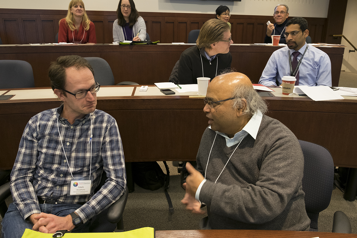 University faculty from across schools and departments gathered for the iTeach symposium Jan. 9 in the Knight Center. The event focused on innovative and evidence-based teaching. Here, Louis Woodhams (left) and Swami Karunamoorthy, both of the School of Engineering & Applied Science, join in a discussion during the session “Integrating Active Learning with Clickers.” (Photo: Sid Hastings/Washington University)