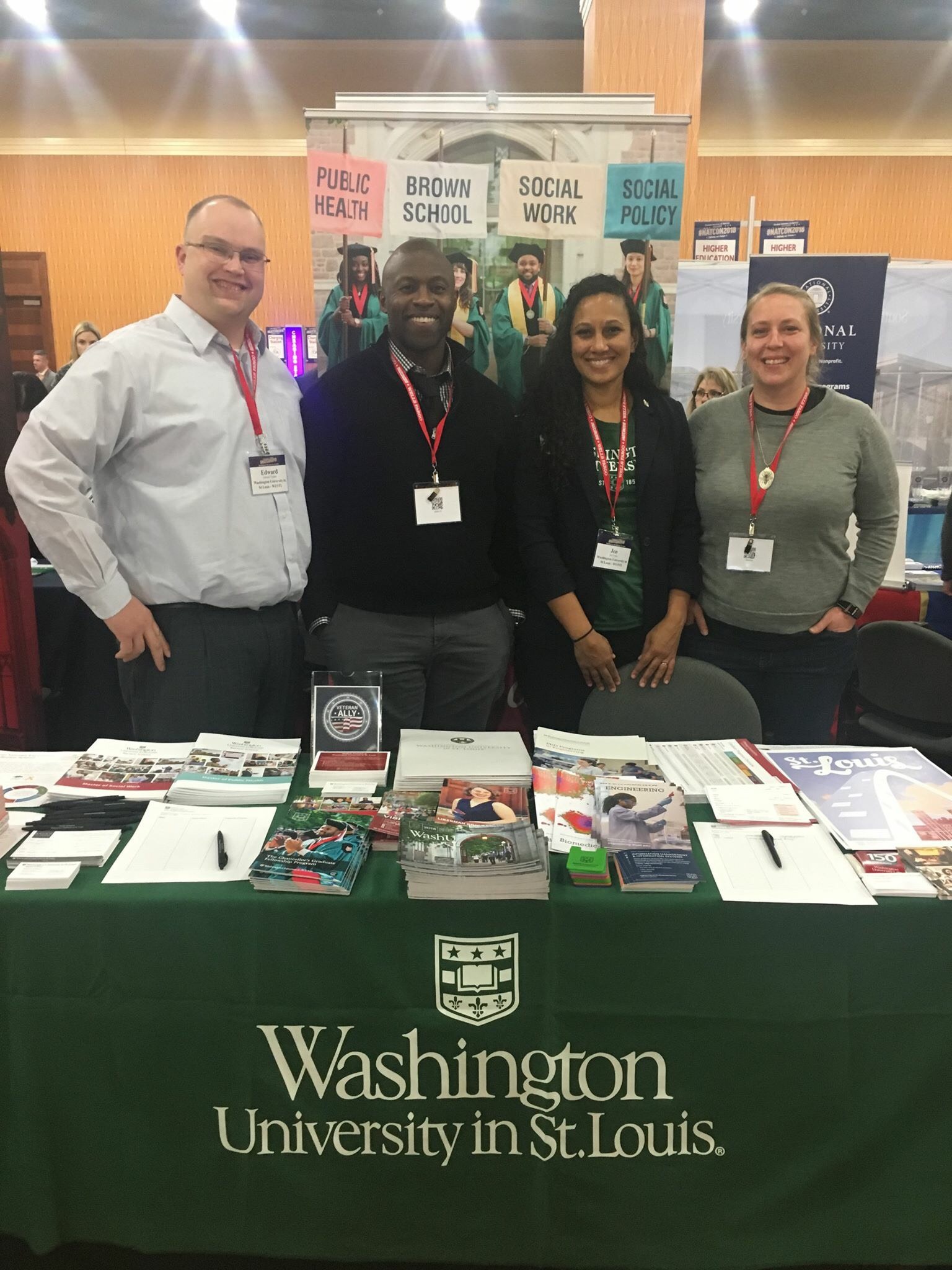 School of Law student Edward Tjaden, WUVets president (left); Joshua Walehwa, associate director of admissions and recruitment for the Brown School; Jennifer Goetz, veteran student services advisor, and Brown student Angela Peacock, WUVets secretary, represented the university at the Student Veterans of America annual convention in San Antonio. Last year, WUVets was named SVA Chapter of the Year.