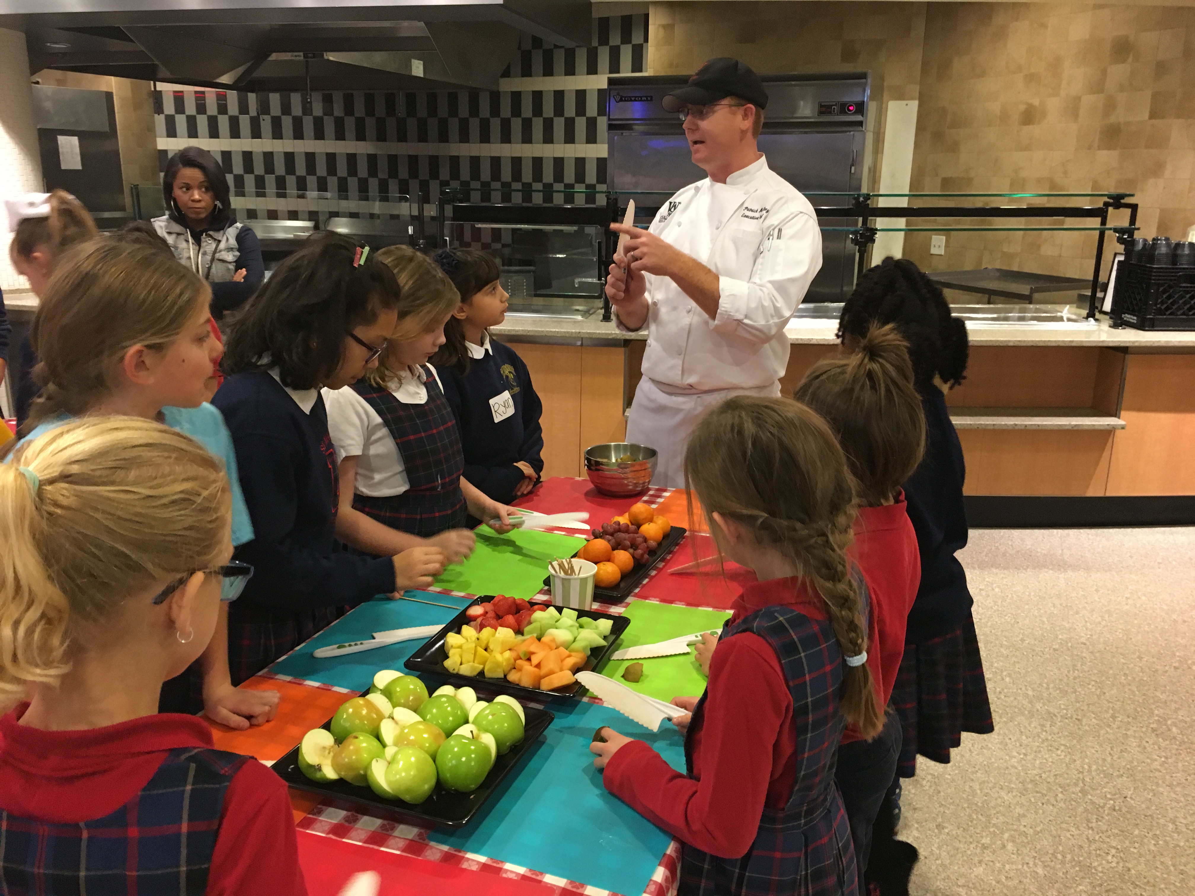 Washington University Executive Chef Patrick McElroy welcomed St. Margaret of Scotland third-graders into the South 40 kitchens for a “Healthy Kids in the Bon Appétit Kitchen” workshop.